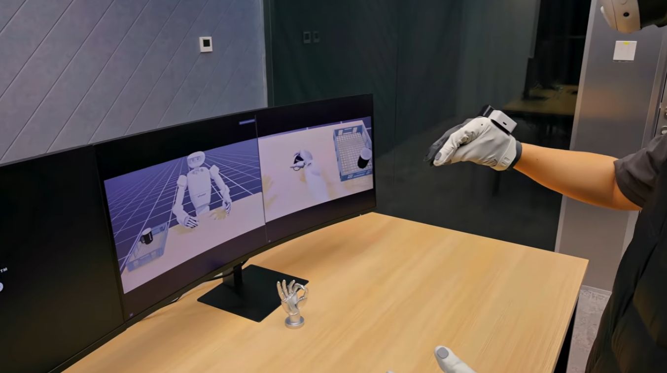在用例中,操作员佩戴MANUS手套在Isaac Lab里遥控1:1拟人化的22自由度机器人Sharpa Wave。手部配置直接映射到机器人关节位置,以创建一个更符合人类运动学的远程操作界面。