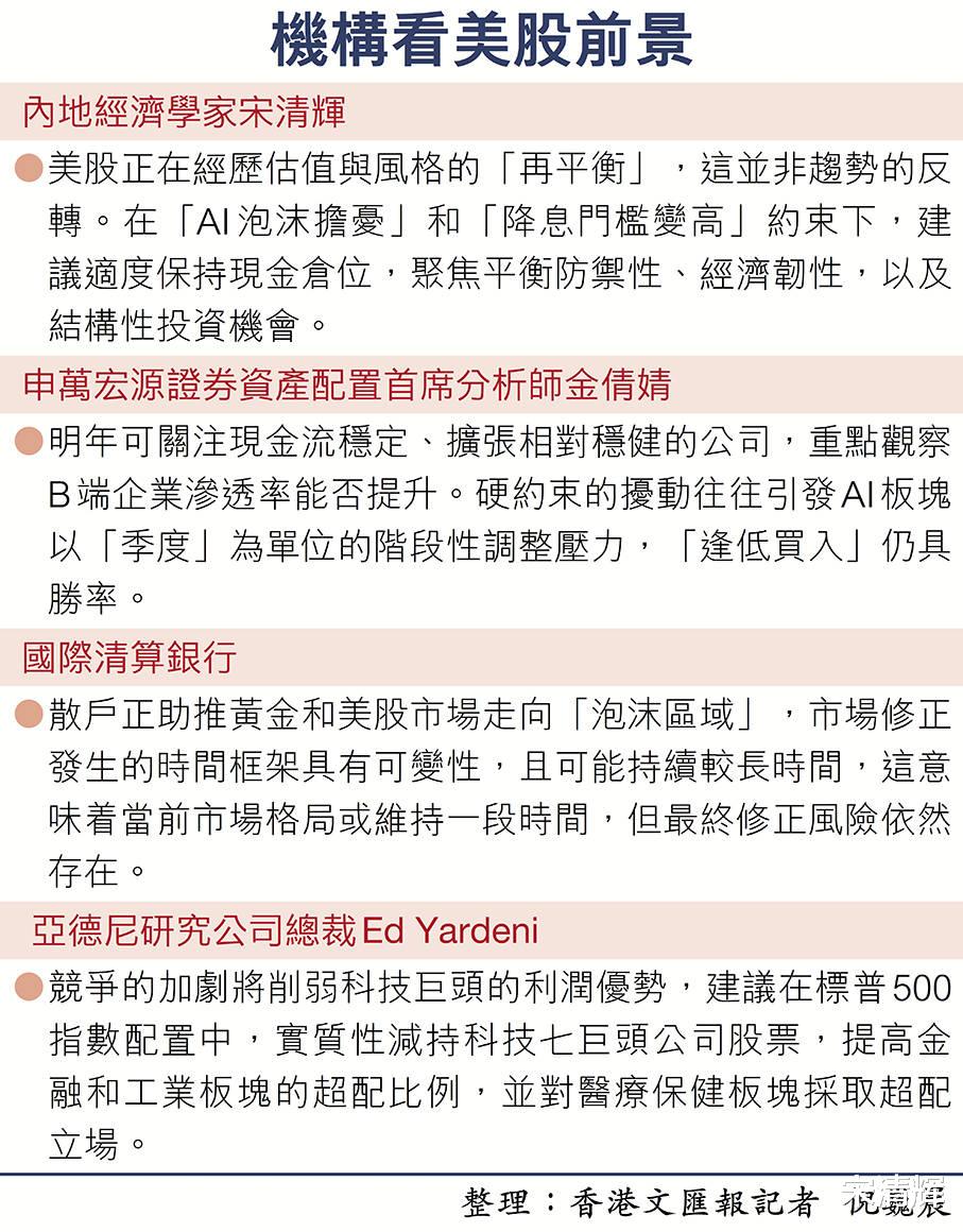 宋清辉强调,在「AI泡沫担忧」和「降息门槛变高」双重约束下,市场对年末美股走势已现分歧,建议适度保持现金仓位,策略上聚焦平衡防御性、经济韧性,以及结构性投资机会。操作层面,对于「七巨头」仓位过度集中的投资者,应考虑实质性减持,锁定年内盈利,并将关注点转向建筑、重工业、基建等「经济韧性」主题。此外,尽量规避单纯依赖概念或长期预期的高风险AI股,转而聚焦大型制药、医疗器械、零售、食品饮料等当前盈利确定性高、现金流健康的标的。