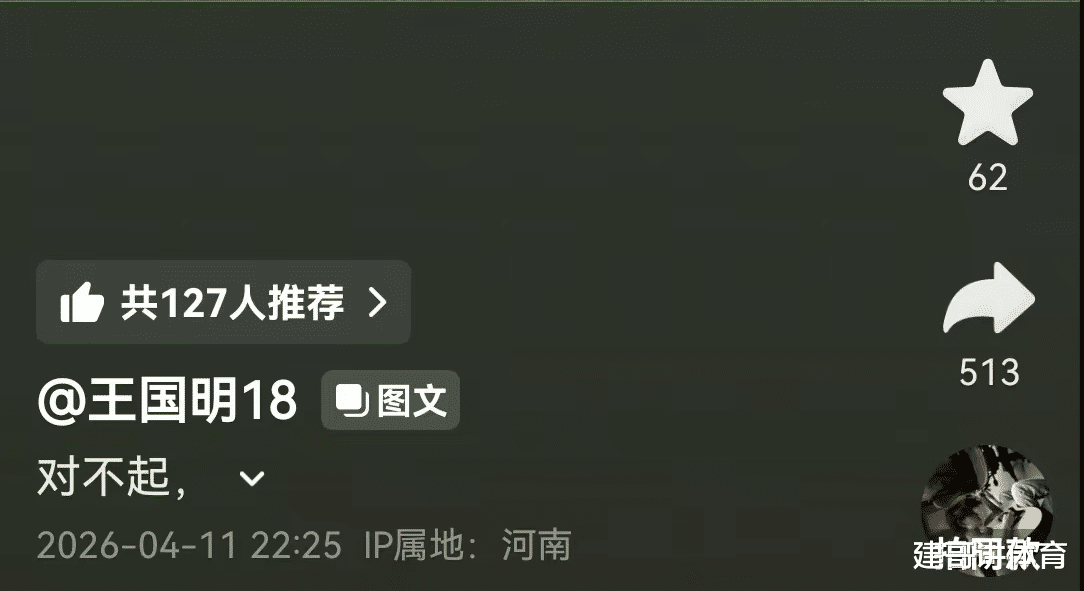 在河南队主场的转播镜头不断给失误丢球的王国明镜头后,赛后的王国明,也在比赛结束不到一个小时后,更新了个人社交,发布了道歉声明。在北京时间4月11日晚22:25分,王国明在个人社交上发布了一张他在这场比赛中抱头的照片,并配上了三个字:对不起。王国明的这则道歉声明,瞬间引爆了河南球迷的情绪,大家对王国明给出了更多的包容和理解,希望他能调整好心态。