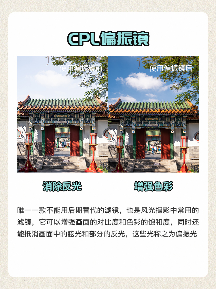 消除反光,提升蓝天/绿叶饱和度,风光拍摄必备