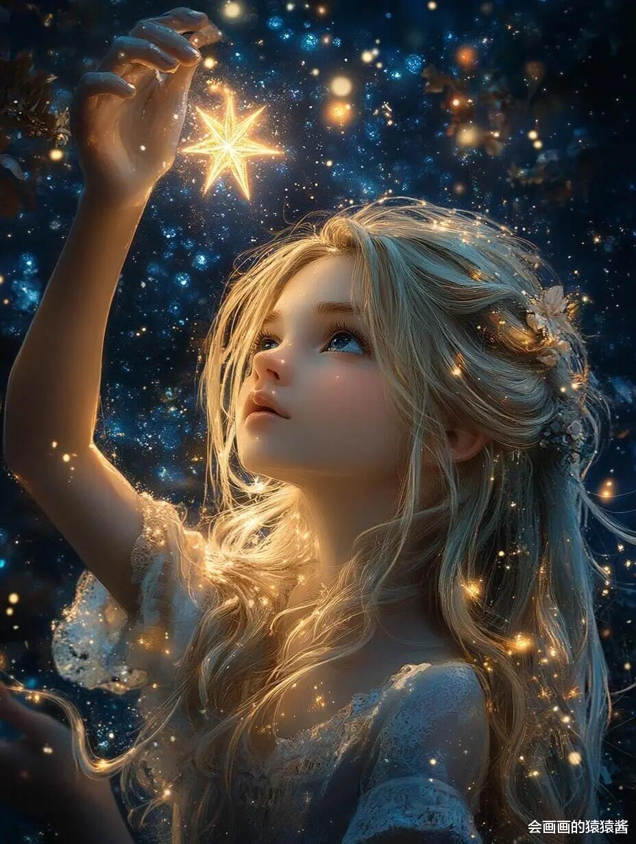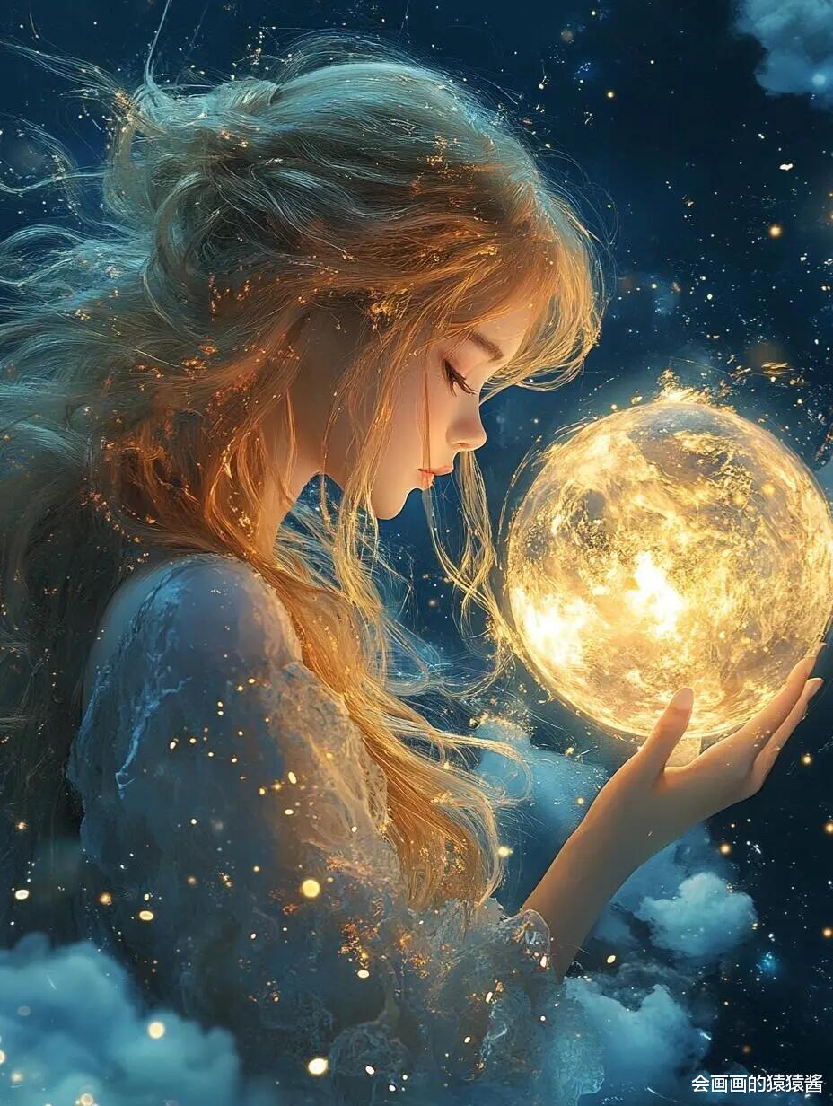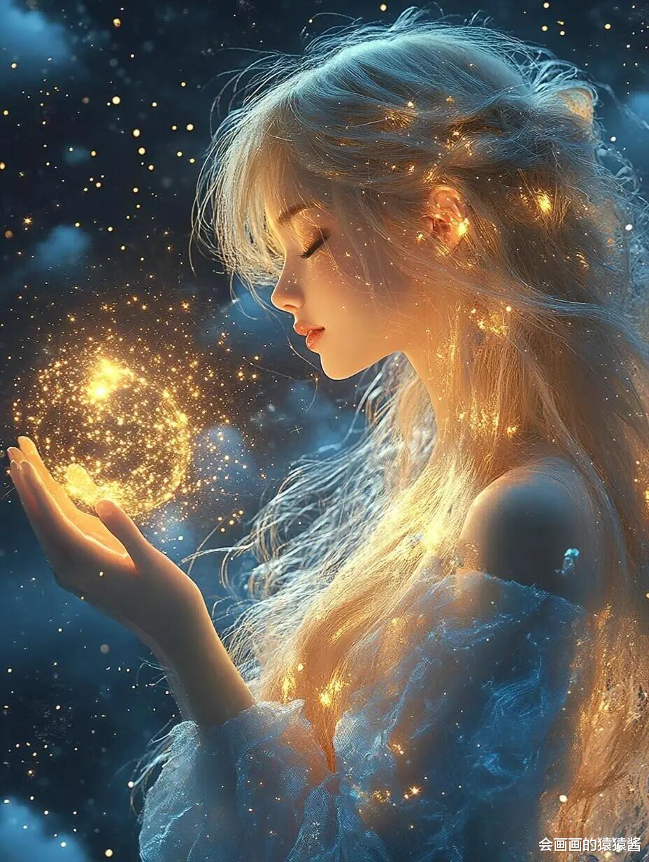 星月少女主题的梦幻治愈系作品,核心是通过光影与氛围的精准把控,营造出静谧温柔的星空意境。画面以深邃蓝调夜空为基底,金发少女垂眸轻捧发光球体,发丝在微光里泛着鎏金光泽,周身散落的星尘与漂浮的云朵交织,暖金球体与冷蓝背景形成柔和冷暖对冲,让画面既充满童话感又不失呼吸感。