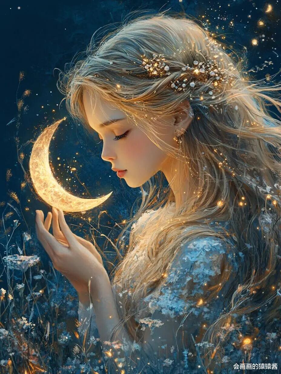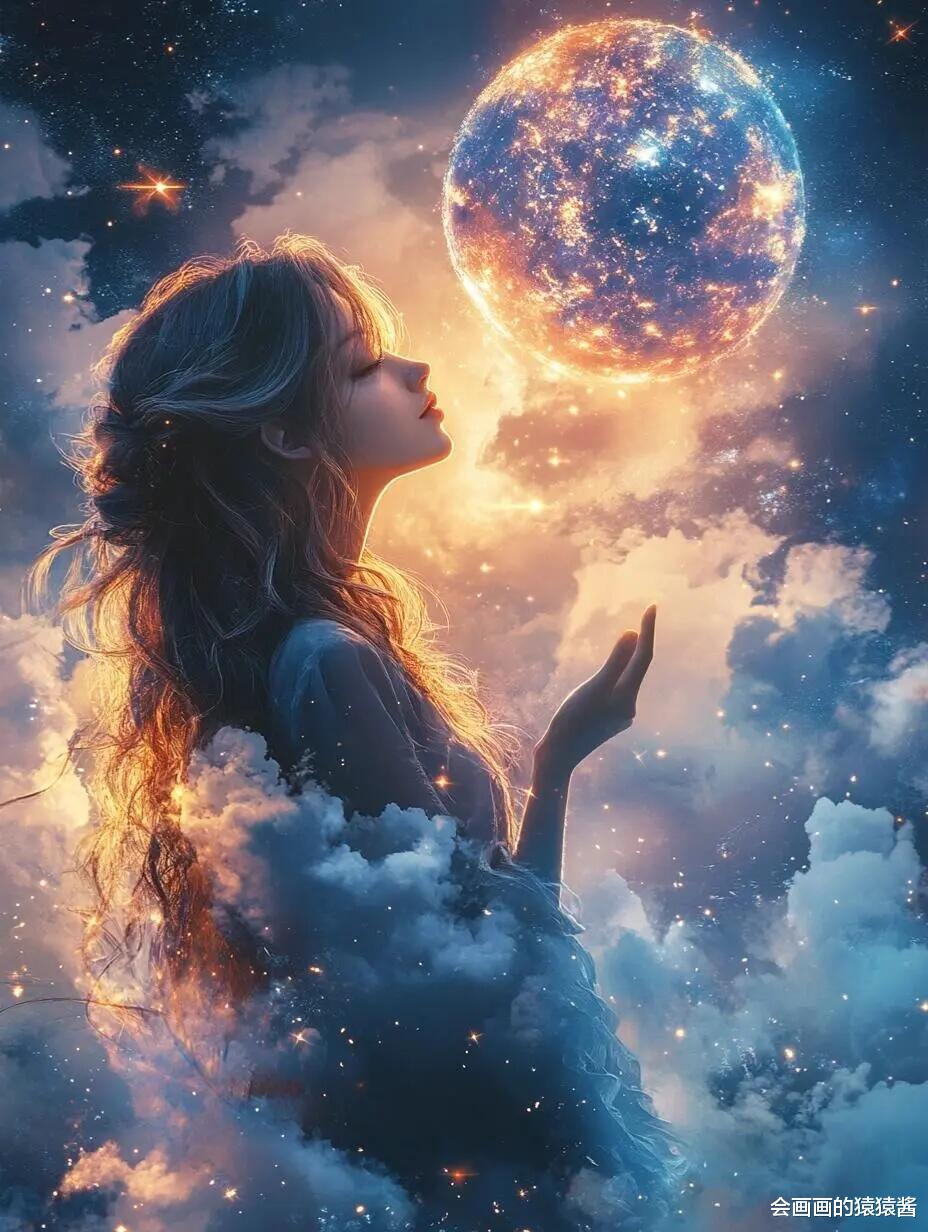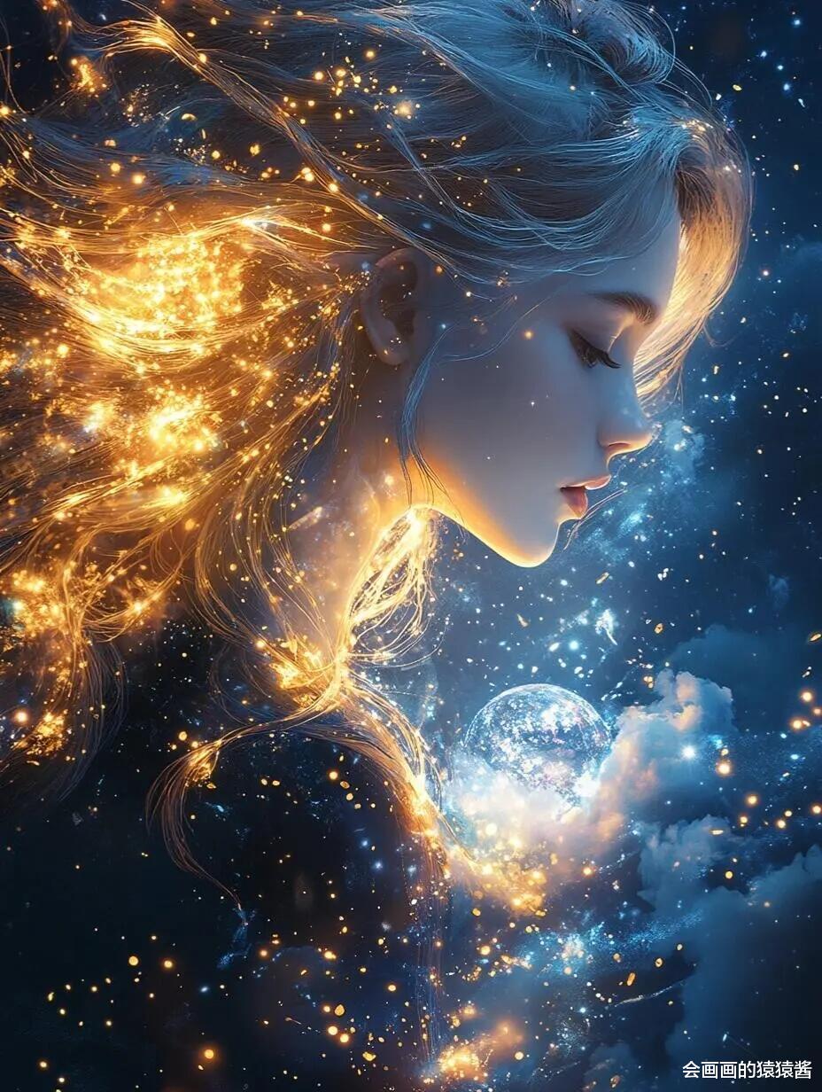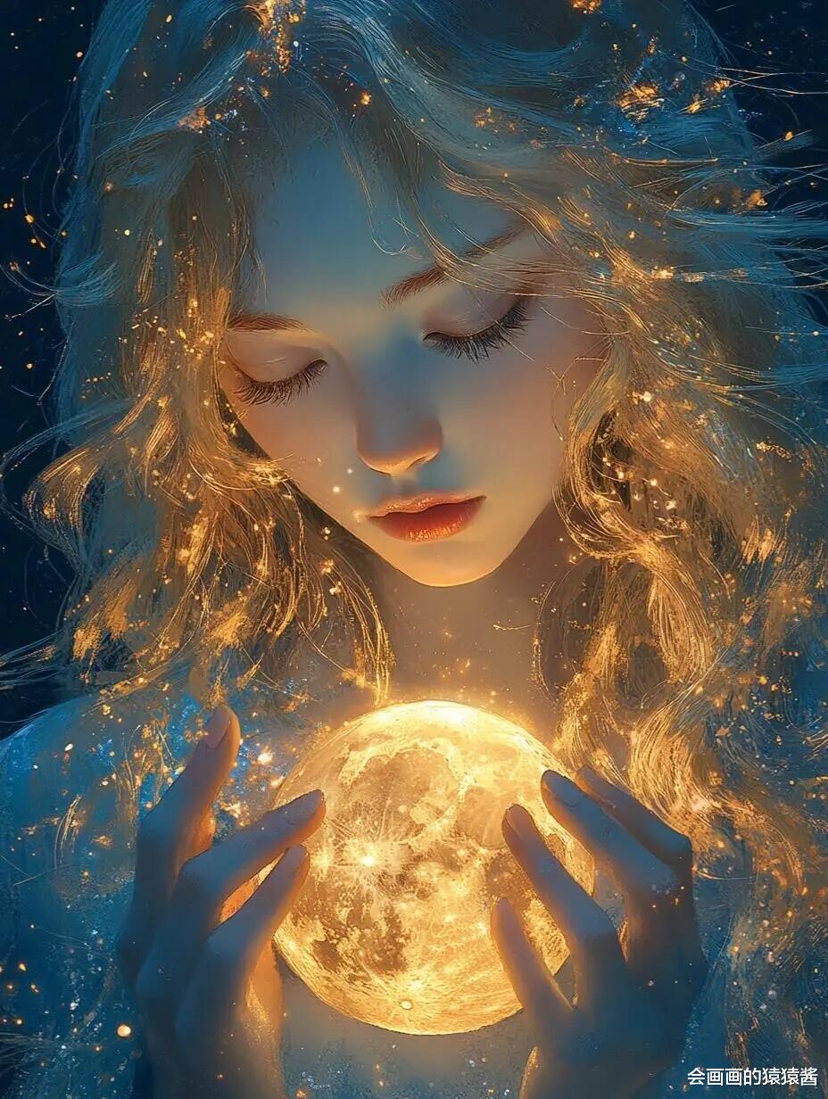 星月少女主题的梦幻治愈系作品,核心是通过光影与氛围的精准把控,营造出静谧温柔的星空意境。画面以深邃蓝调夜空为基底,金发少女垂眸轻捧发光球体,发丝在微光里泛着鎏金光泽,周身散落的星尘与漂浮的云朵交织,暖金球体与冷蓝背景形成柔和冷暖对冲,让画面既充满童话感又不失呼吸感。