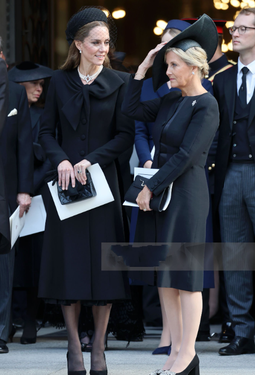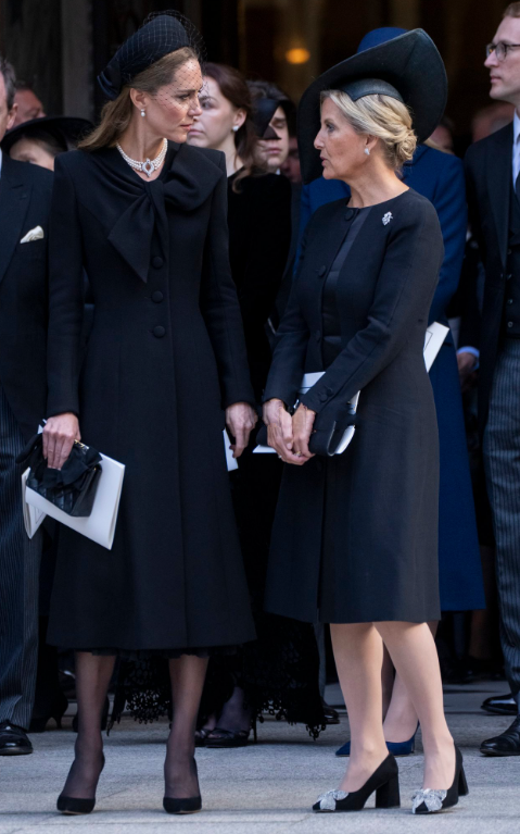 由于葬礼仪式并不是一直进行,到场宾客也会聊天,比如凯特王妃遇到了三婶苏菲王妃,俩人站一起热聊,还被摄影师拍下来。