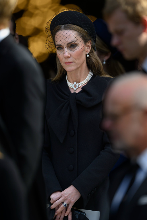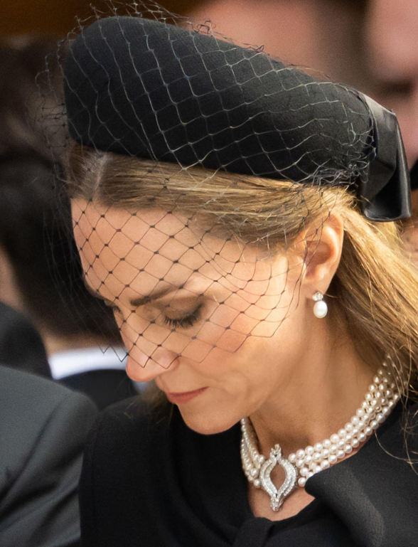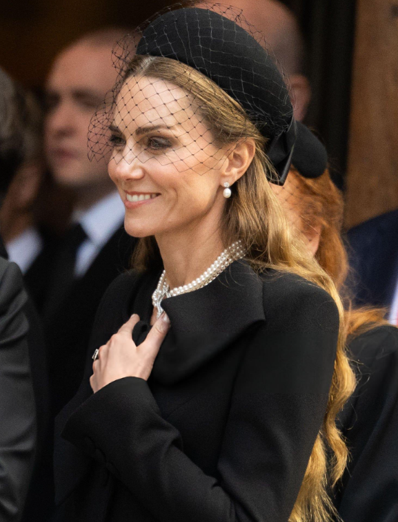 为了出席葬礼,凯特选择了黑色风衣,佩戴多股珍珠项链,一身全黑穿搭戴着网状礼帽,看起来好美,也给人一种朦胧的美感!
