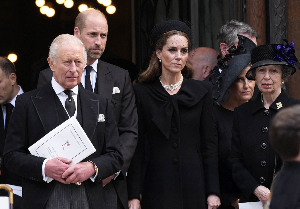 凯特一直站在威廉与查尔斯旁边,她伤心的时候表情高冷,微笑的时候很温柔,估计和自己也没有什么血缘关系,不像已故女王是自己的婆奶奶,所以也并没有那么伤心。
