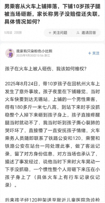 男子回应“从火车上铺跌落砸伤10岁女孩后失联”:目前失业,讨薪后将一次性还清这起火车上的意外事故,因为后续的**“失联与