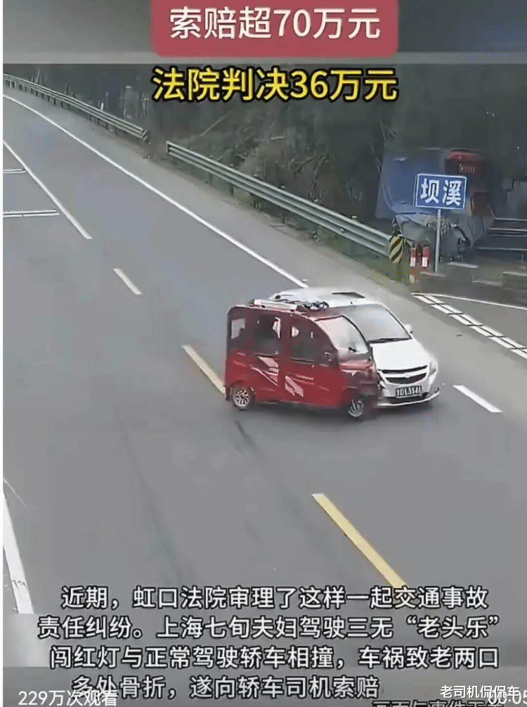 跟大家说个最近闹得沸沸扬扬的事,上海有一对七旬老两口,开着一辆无牌、无证、无保险的“三无”“老头乐”,过马路的时候直接闯红灯,结果跟正常绿灯通行的轿车撞在了一起,撞得还挺厉害,老两口都多处骨折、受了伤残。