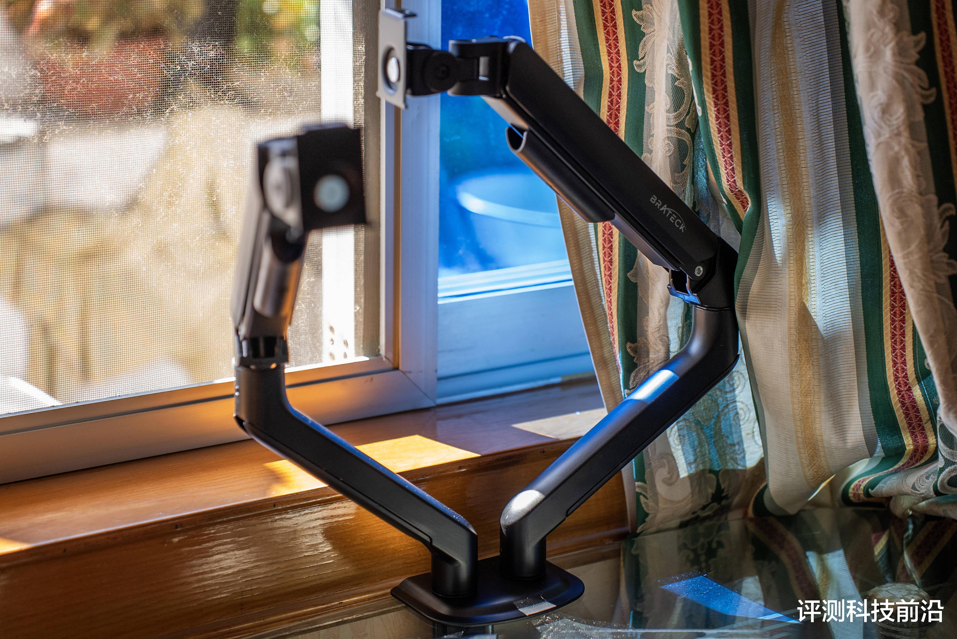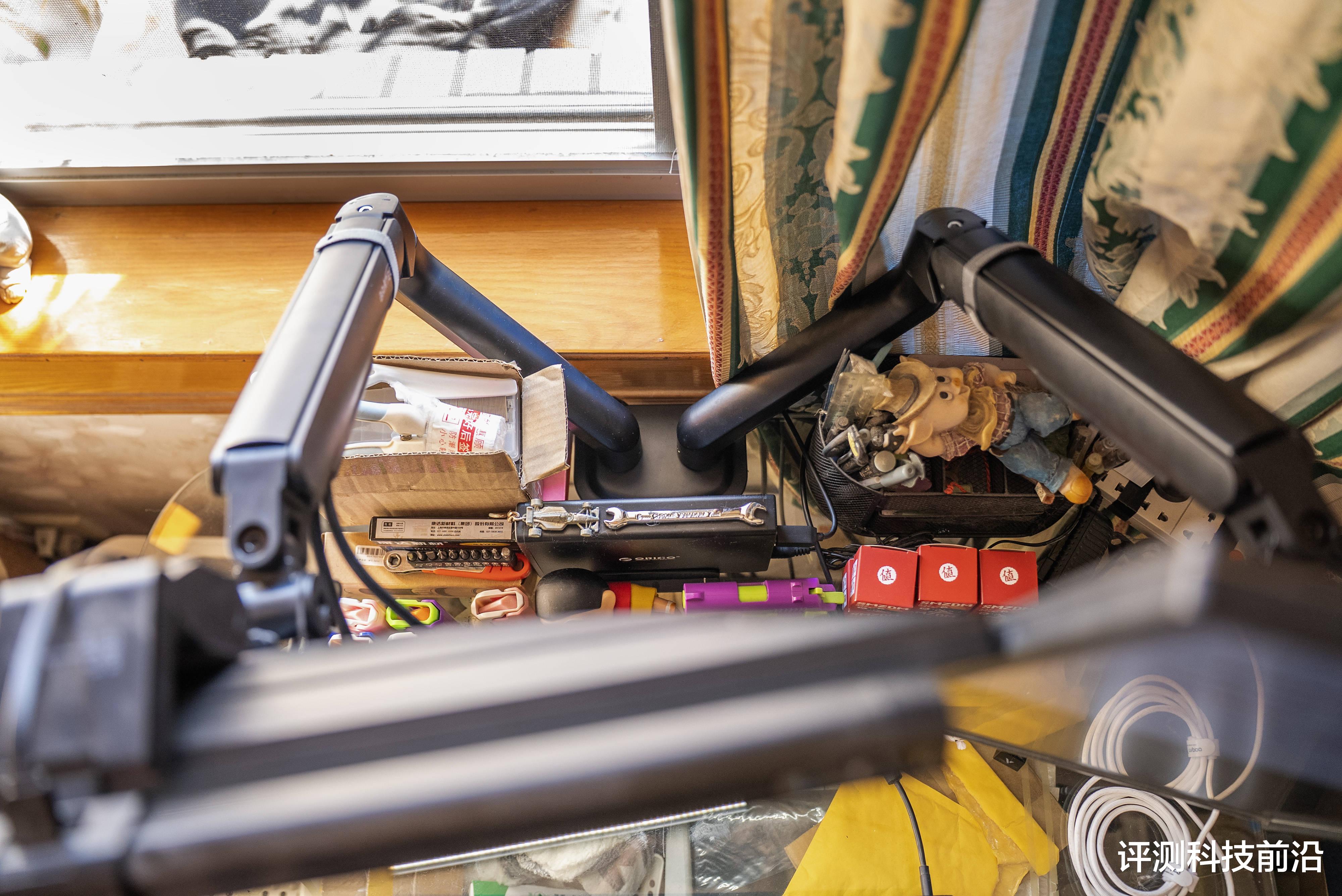 ▼升降支架的优点显而易见,只需占用桌面这么一点空间就能放下两台显示器,比单台常规显示器支架都要小,关键还很稳,太舒服了