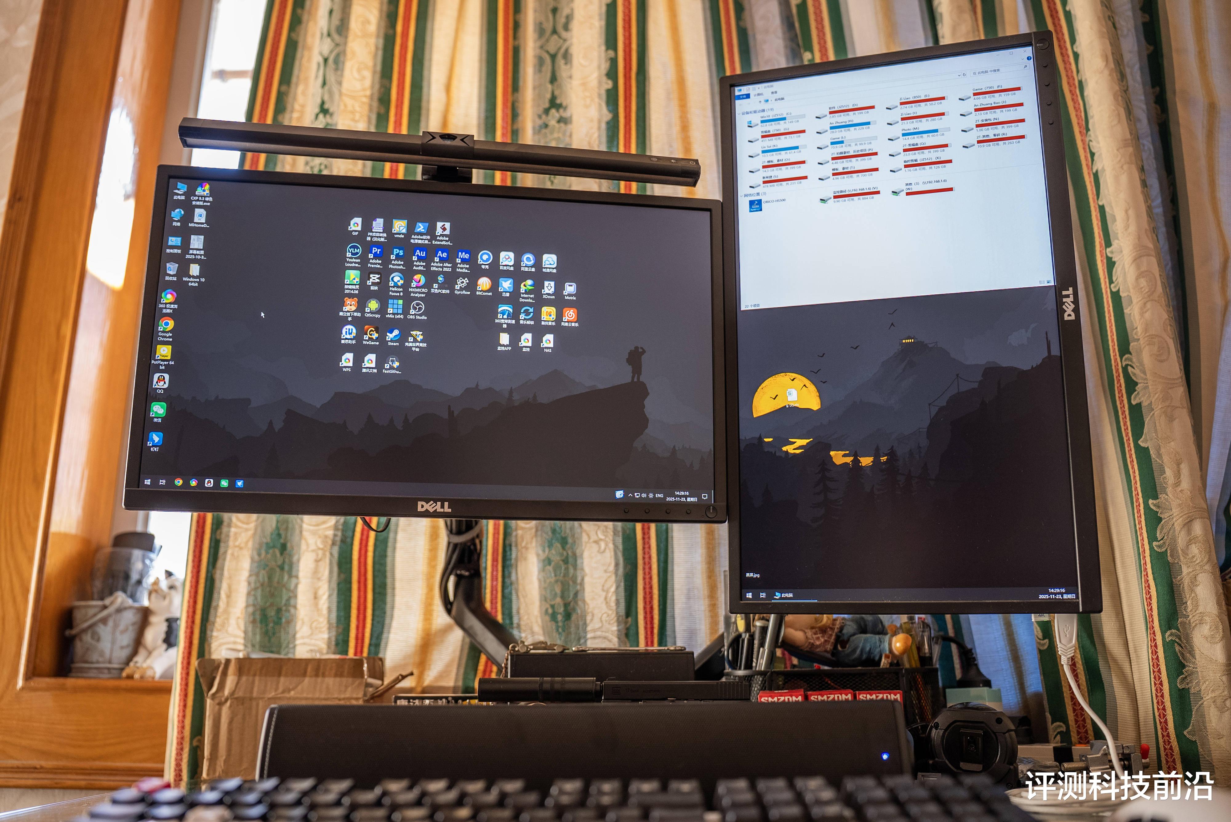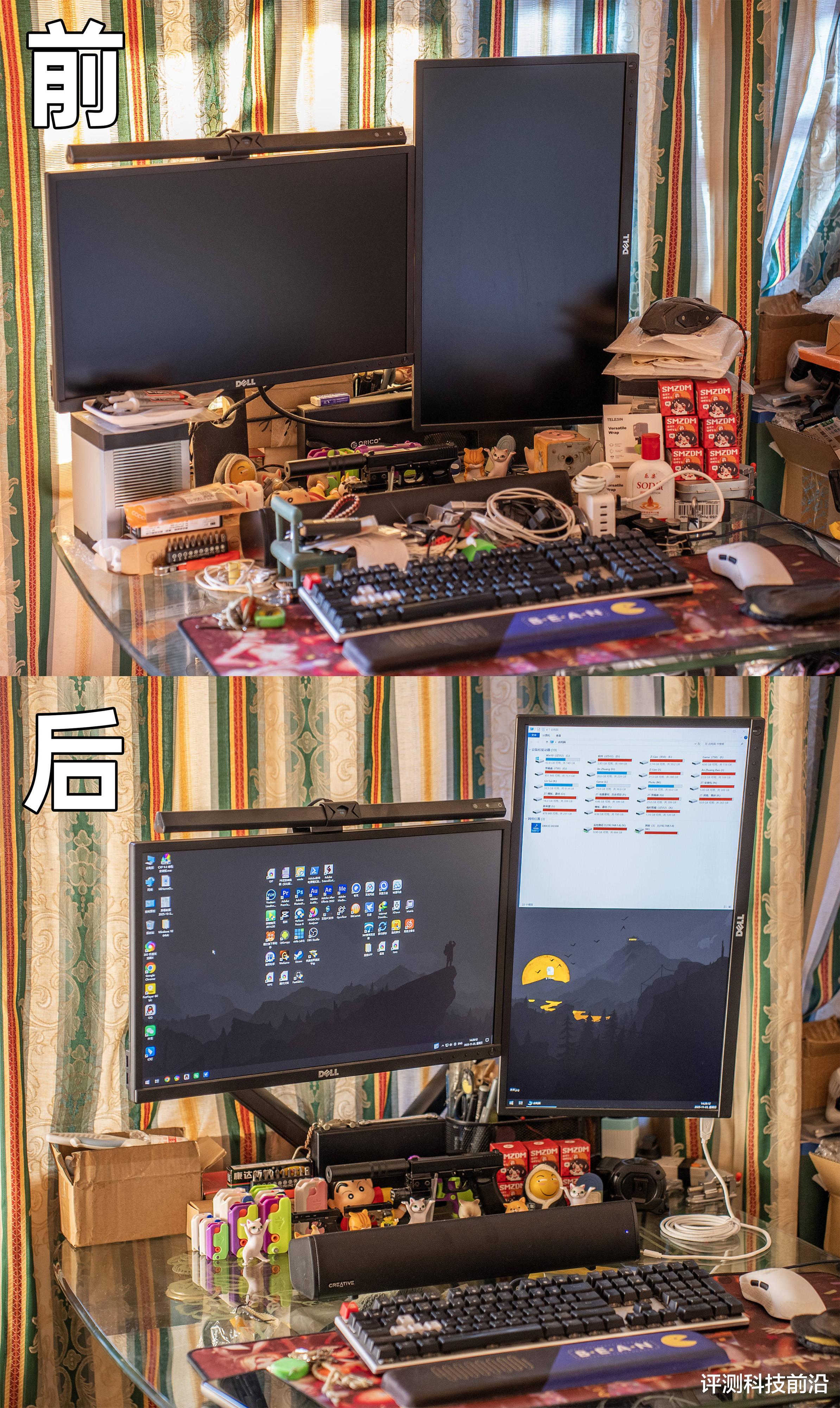 ▼先看一下我更换支架前后的对比,有了这款北弧E350EZ-2双屏显示器支架,显示器的高度上限提高了不少,显示器下方空间就腾出来很多,可以放下更高的东西,因为屏幕下方没有底座了,所以就可以把很多东西都放屏幕下面,桌面摆放更自由