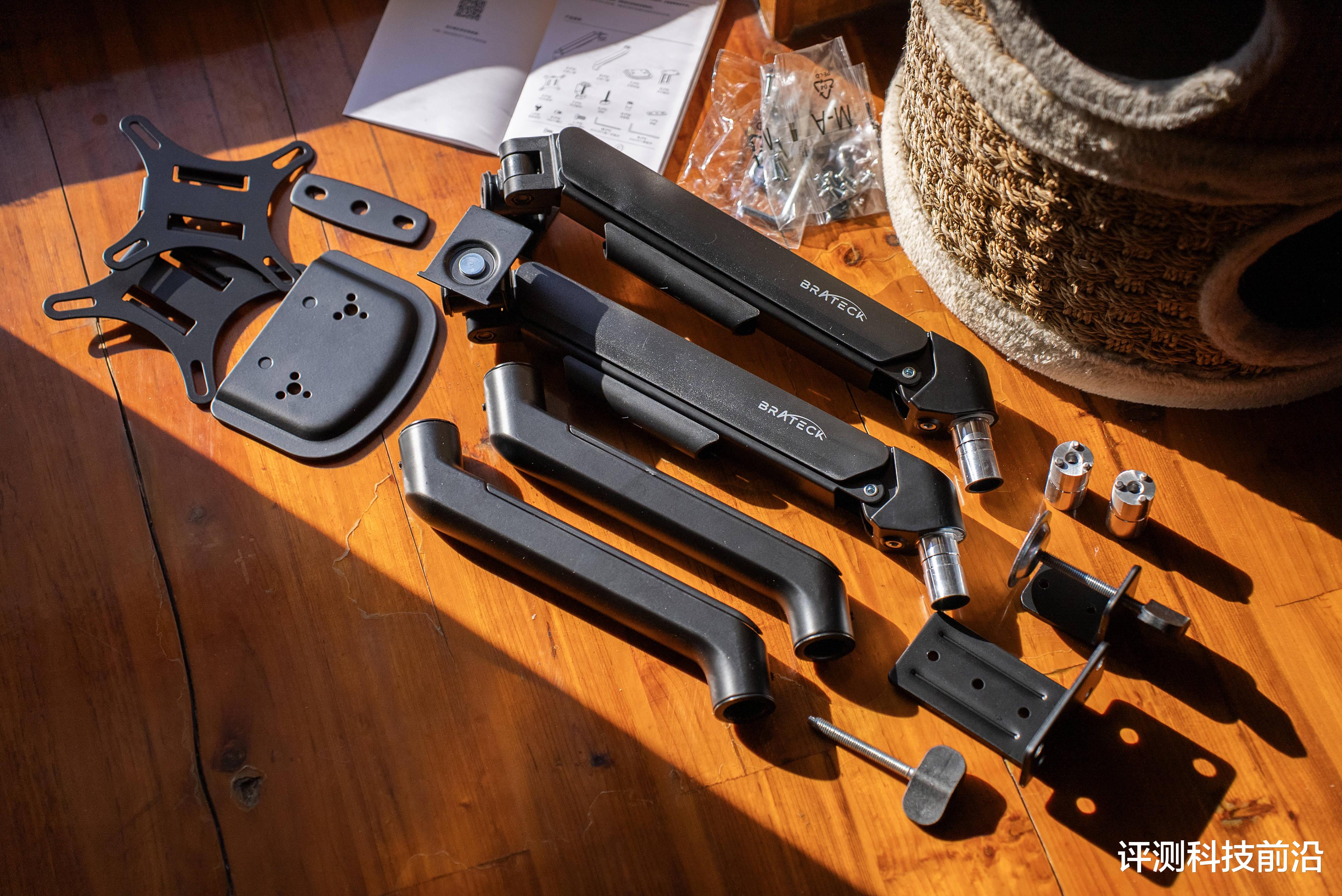 ▼取出所有东西,配件还是蛮多的哈,说明书上也都有对应的名字,初次使用这类支架的朋友们可以先看看说明书再去安装,这款支架支持穿孔安装和夹持安装,我以夹持安装演示