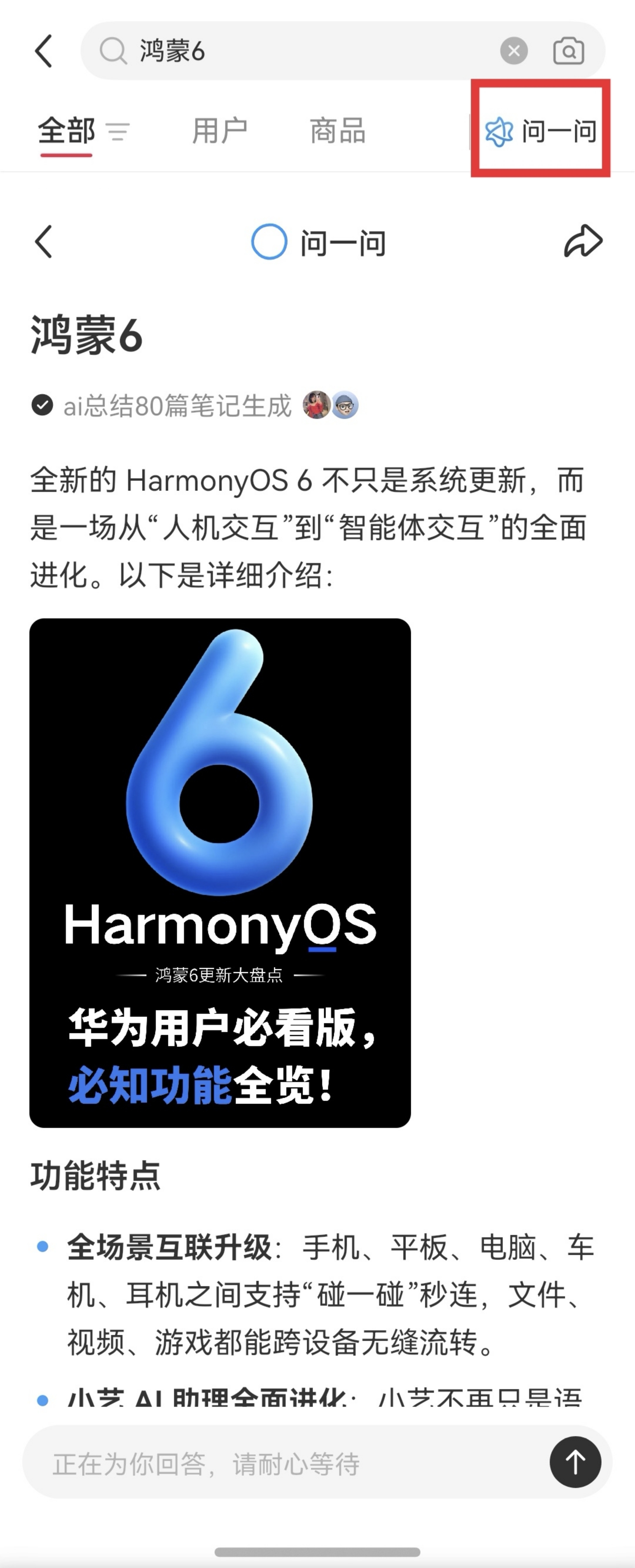 随时随地问一问:点击搜索结果页右上方的“问一问”,即可获取基于小红书笔记生成的AI回答内容,还能查看参考来源、继续追问更多,或者分享给小红书好友,快速帮你种草好物;
