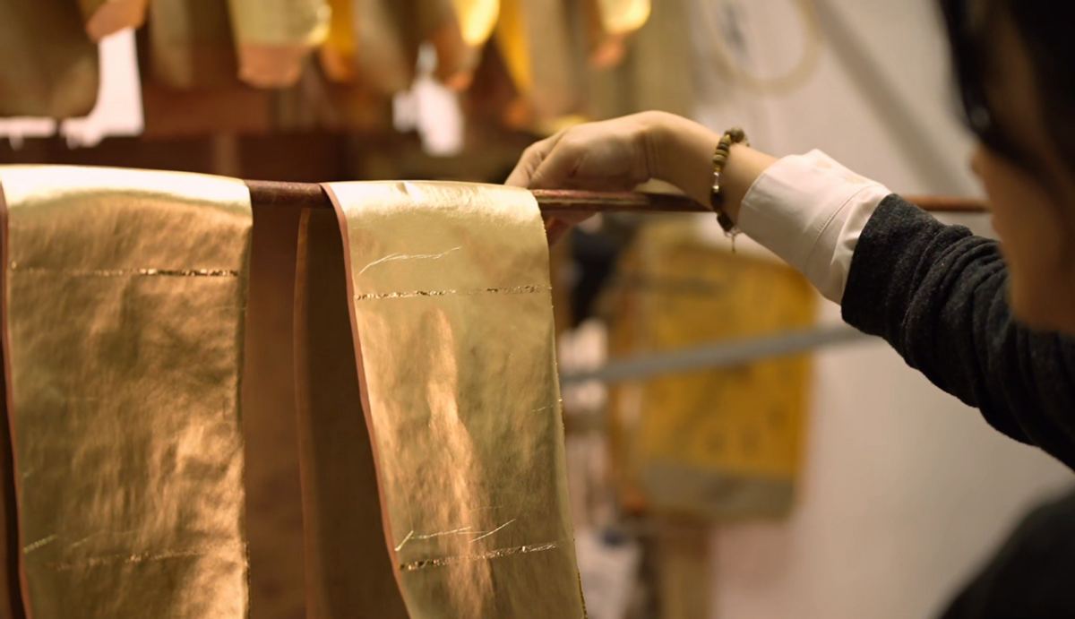 她在云锦发源地邂逅光电云锦创始人,双方一见如故、一拍即合,历经数月选料、设计、定稿,正式开启这场跨界创作。原料上,选用纯黄金打造的金箔为基材,全程遵循千年古法制作金线,晾干、压筋、缠丝每一步都容不得半点偏差;为契合云锦“图必有意,意必吉祥”的文化内核,她坚持选用人工无法复刻天然光泽的翠羽线,赋予作品松柏常青的吉祥寓意。