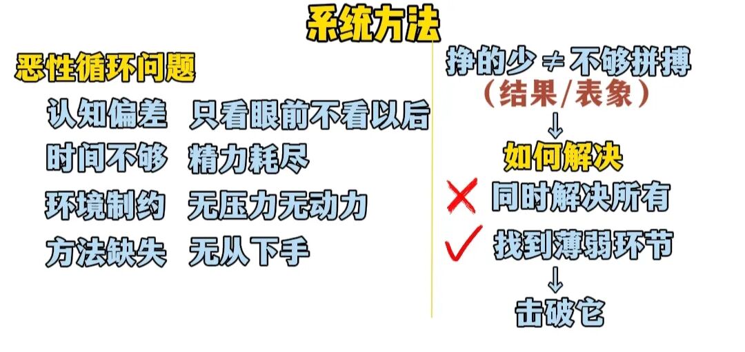 所以我们要如何解决呢,千万不要想着同时解决所有问题,我们要做的是找到这个恶性循环中最薄弱的一环,打破它,整个循环就可能停止或极大缓解,