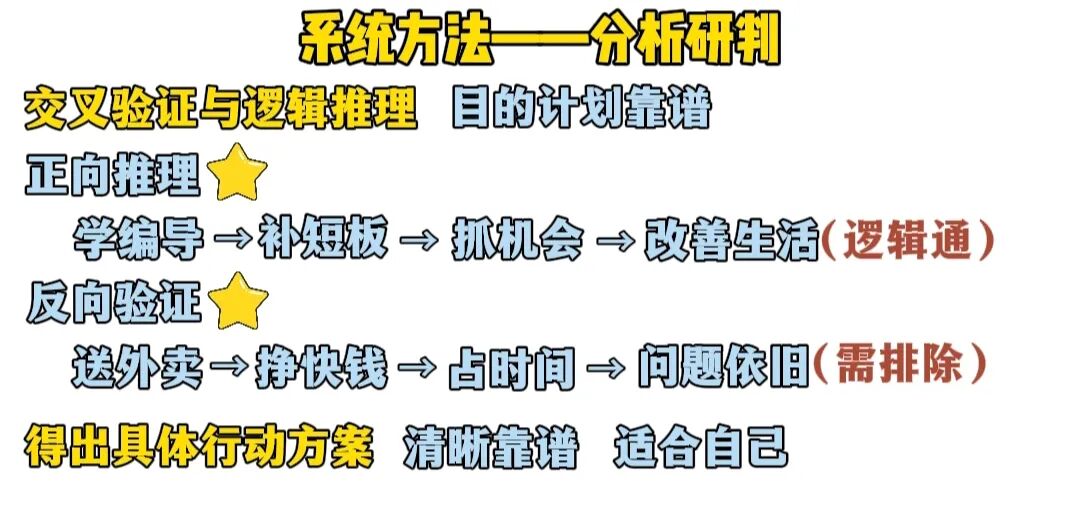 再看反向验证,如果你下班去做那些纯用体力能多挣点的活,比如送外卖,这样虽然能快速挣点,但无法解决根本问题,还可能占用学习时间,从长远看也是条死胡同,那这个选项就要排除掉,最后一步得出具体行动方案,经过上面两步,我们就能得出一个清晰靠谱且适合自己的方案了,这时候它就不再是空想不是一句口号,而是基于事实的推论。