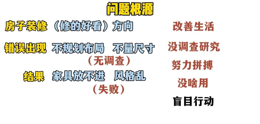 装的好看就是确定方向,跟多数人要改善生活的目标是一个意思,但没量尺寸没规划布局,这就是没做调查研究这个环节,所以最后乱糟糟没效果,就跟很多人努力工作熬夜加班,疯狂学习想着来改善生活但发现最终没多大用道理是一样,都是盲目行动的后果。