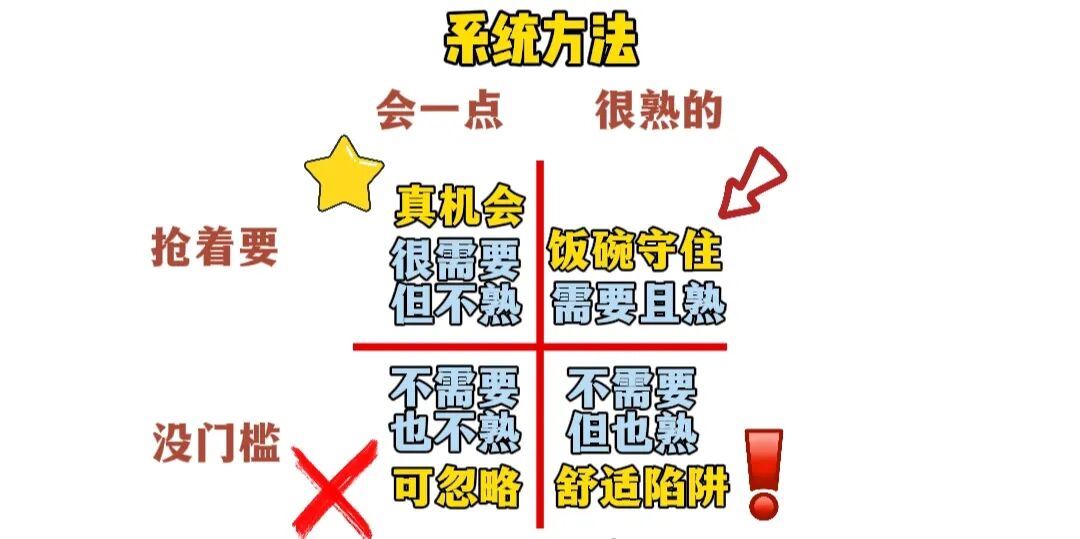 横着看左边代表你只会一点的,右边是你很熟练的,然后你把你想学的和会的技能填进去,最后你能发现左上角格子是市场很需要但你不熟练的技能,这也就是你的机会所在,最应该花时间精力学习的方向,右上边格子是市场需要且你很熟练的技能,好比视频剪辑,这可以说是你吃饭的家伙事,是你核心优势你要守住,左下角格子是市场不需要又不怎么会的,除非个人喜好,不然直接忽略,右下角格子是市场不需要但你很熟练的技能,所以你就不能花费更多时间精力在这上面了,等你都写完你就能发现,你要做的是守住右上角,针对左上角全力学习,右下角你要警惕别浪费时间精力,左下角放弃就行了,先别管,是不是瞬间你就知道时间精力应该优先用在哪一块了。