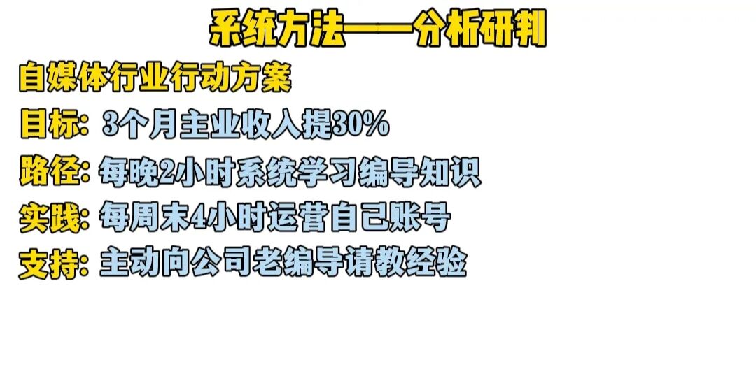 如果是自媒体行业可能最后的行动方案是,未来3个月,我的核心目标是将主业收入提升百分之三十,主要路径是利用每天晚上的两小时,系统学习短视频编导知识,包括选题策划脚本编写账号运营等等,目标是年底前从单纯的视频剪辑师转型为能独立负责项目的短视频编导,同时运营一个自己的知识分享类短视频账号,每个周末用抽出4小时,将所学的编导技能直接用于实践,积累作品集并验证市场反馈,这期间我还会主动向公司的资深编导请教。