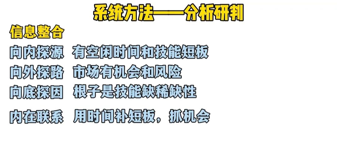 当我们把它们整合在一起,你就会发现内在联系,就是我有时间,去弥补市场有需要但我还不会的技能,正好能解决挣的少的问题,这也正是将最初零散的信息,系统化整合从而产生一加一大于二的合力。