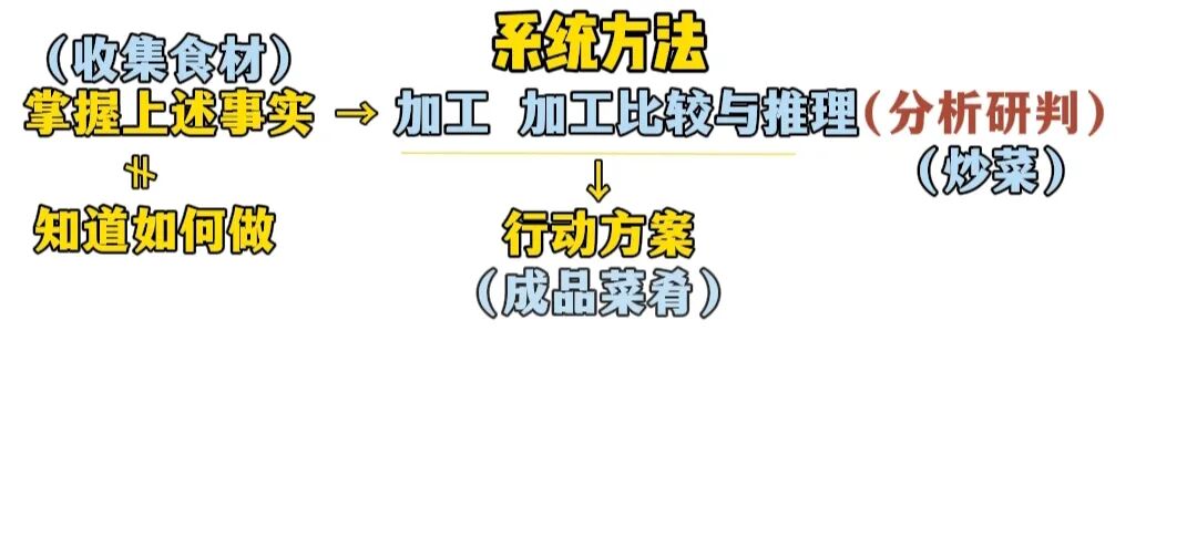但是就算我们掌握了这些从三个维度调查来的事实,也并不等于就知道了该怎么做,我们还要对所有信息进行去伪存真,去粗取精的加工,通过系统性的比较和推理,最终得出一个基于事实的,最值得我们尝试的初步行动方案,这个关键步骤就是“分析研判”,各位别想太难,分析研判理就跟咱们炒菜一样,食材都备齐了,现在要开始炒了。