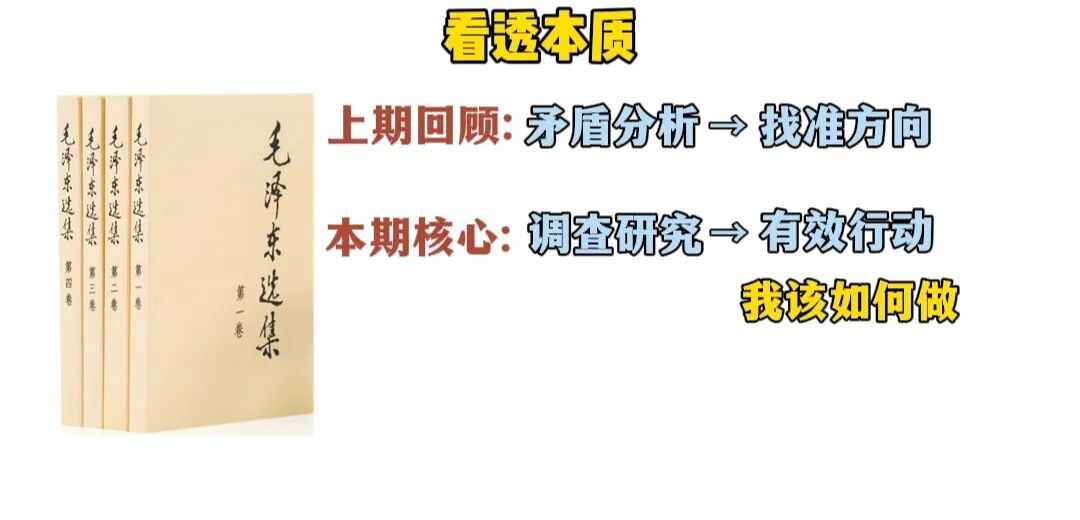 在《毛选》“看透本质”的四大心法体系中,上期我们通过第一步矛盾分析法,结合当下多数人生活现状为案例,找准了影响全局的核心问题,确定了主要矛盾及解决方向,但从“找准问题”到“解决问题”之间,还存在着一道关键的认知鸿沟,本期我们将聚焦第二大心法调查研究,它能帮助我们解决“在方向明确后,该如何有效行动”这一核心问题。