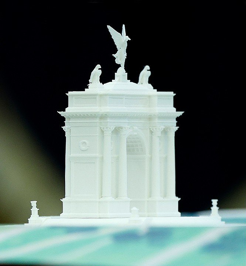 它由建筑师尼古拉斯·利奥·夏尔博诺(Nicolas Leo Charbonneau)设计,效果图显示,建筑气势恢宏,带有明显的新古典主义风格:石碑雕刻花环,双鹰昂首,顶端立有镀金持杖的带翼人像,整体透出强烈的仪式感与军事象征。
