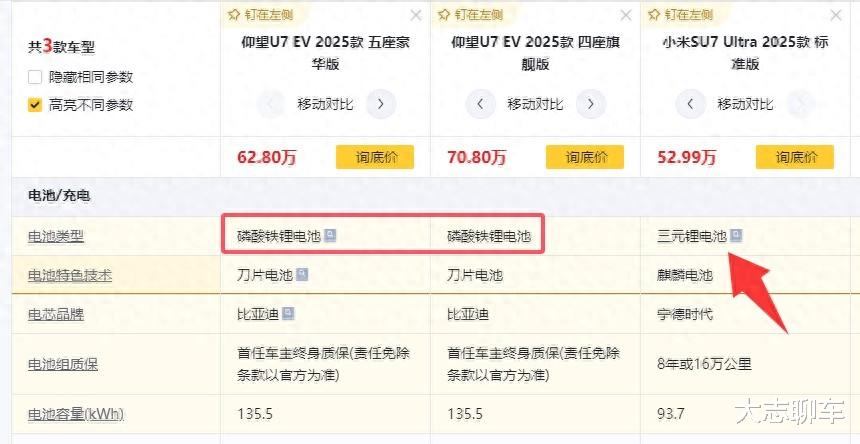 但有意思的是比亚迪在仰望U7的车型上,不管是低配还是高配,用的电池都是磷酸铁锂电池,而小米这边却用的是三元锂电池,要知道,之前的小米SU7车上,小米还用着比亚迪的刀片电池,这时候,不免让我们费解了,既然都是中高端车型了,为啥他们用的电池却不一样。