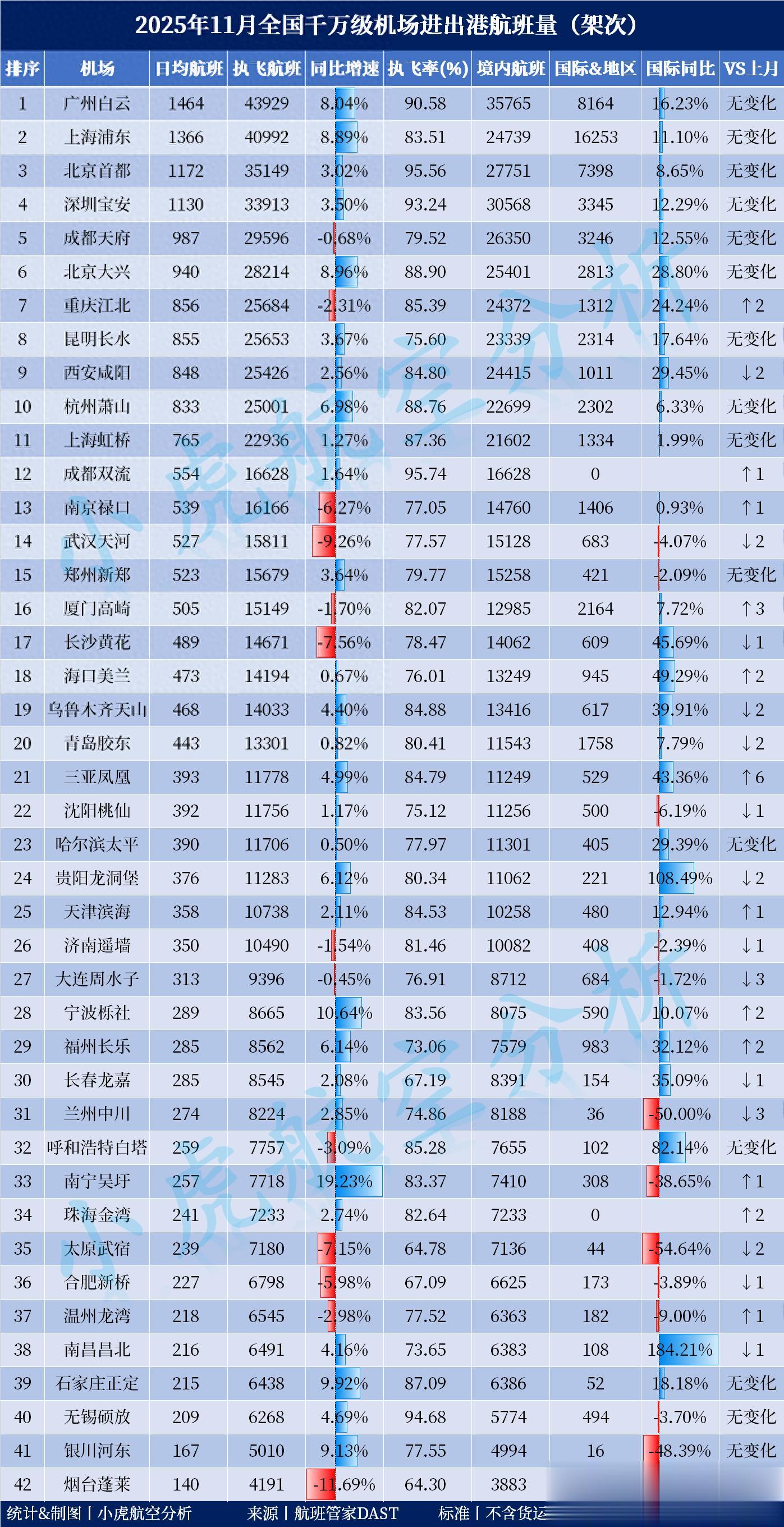 2025年11月全国千万级机场进出港航班量出炉(本列表统计口径不含货运、包机、经停、共享以及虚拟航班)。小编整理了42座千万级机场的单月航班量情况,首先从单月客运航班量方面来看,广州白云机场以43929架次的航班量拿下了首位,较去年同期增长了3269架次,同比增长8.04%,这也是广州白云机场连续第二个月在航班量上力压上海浦东机场。