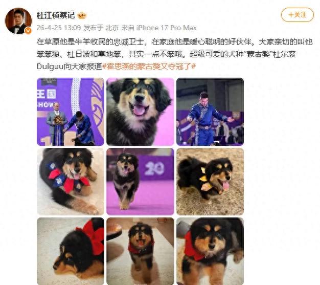 作为“家属”的丈夫杜江随后发文回应,幽默地向网友介绍这只新晋明星狗:“ 草原上他是牛羊牧民的忠诚卫士,在家庭他是暖心聪明的好伙伴。 大家亲切的叫他笨笨狼、杜日波和草地笨,其实一点不笨哦。超级可爱的犬种‘蒙古獒’杜尔衮Dulguu向大家报道。”