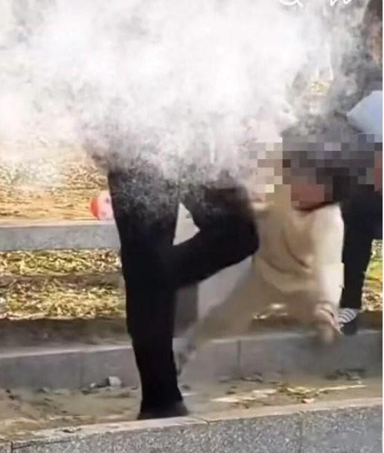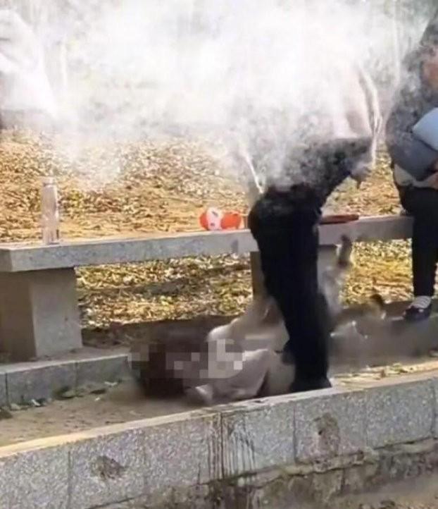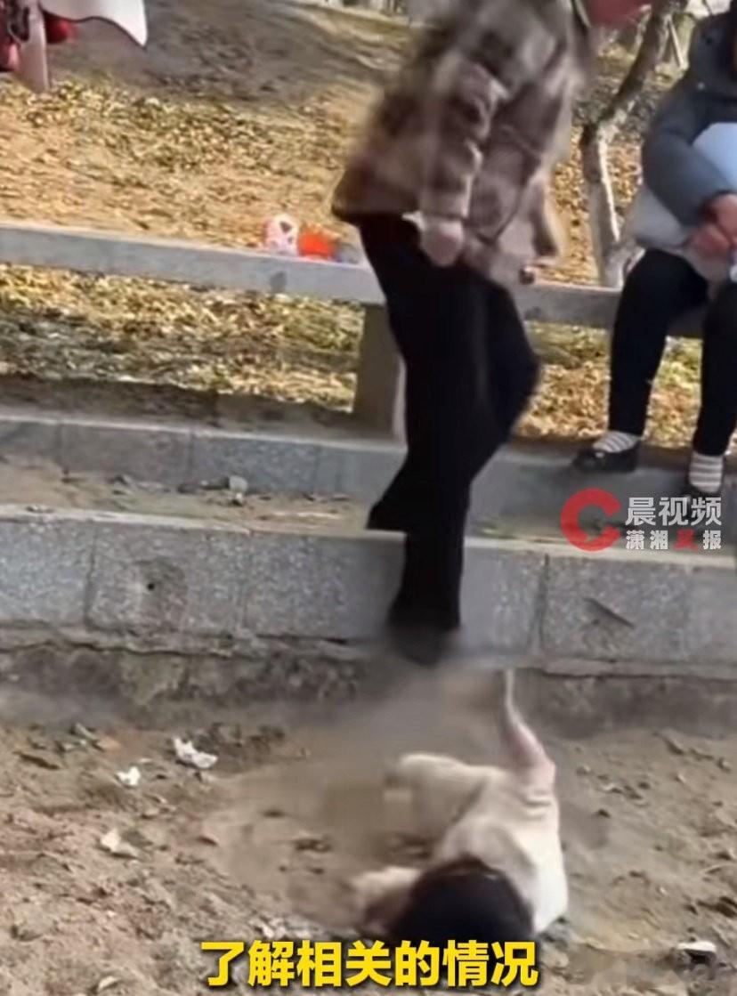 之后又把小女孩给摔倒在路边的草地上,此时小女孩已经疼的哇哇大哭,然而这并未让老太太有所收敛,而是继续对着小女孩的身体、展开猛踹……