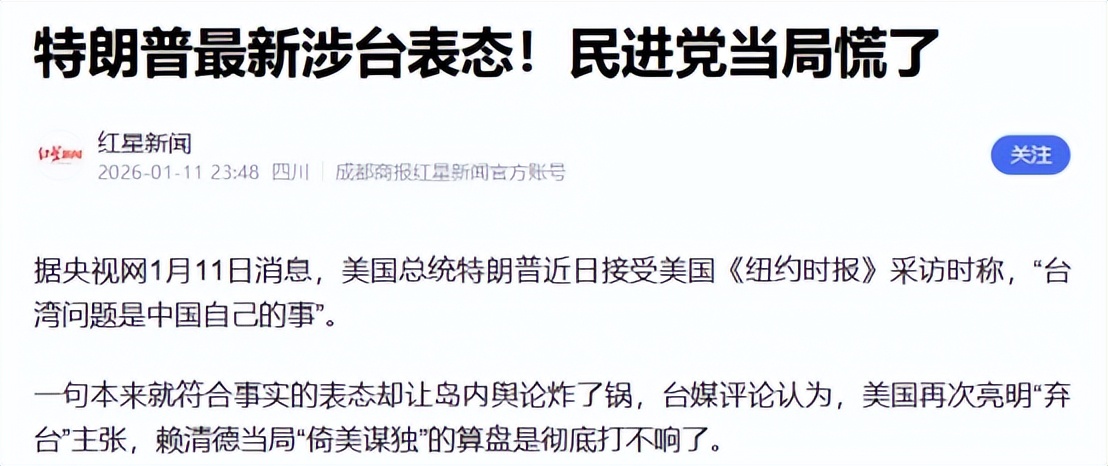观察者网2026-01-12台湾问题是中国自己的事。特朗普最新表态,岛内震动