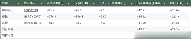 伊利股份当前的EV/EBITDA倍数(约12.7x)低于雀巢(约15.1x),但高于达能(约11.7x),接近同行平均/中值(约13.4x)。