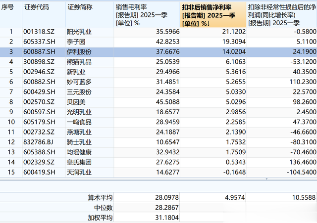 从15家乳企的财务数据(2025年一季度)来看,行业呈现“毛利率分化、盈利质量差异大、增长动能两级分化”的特点: