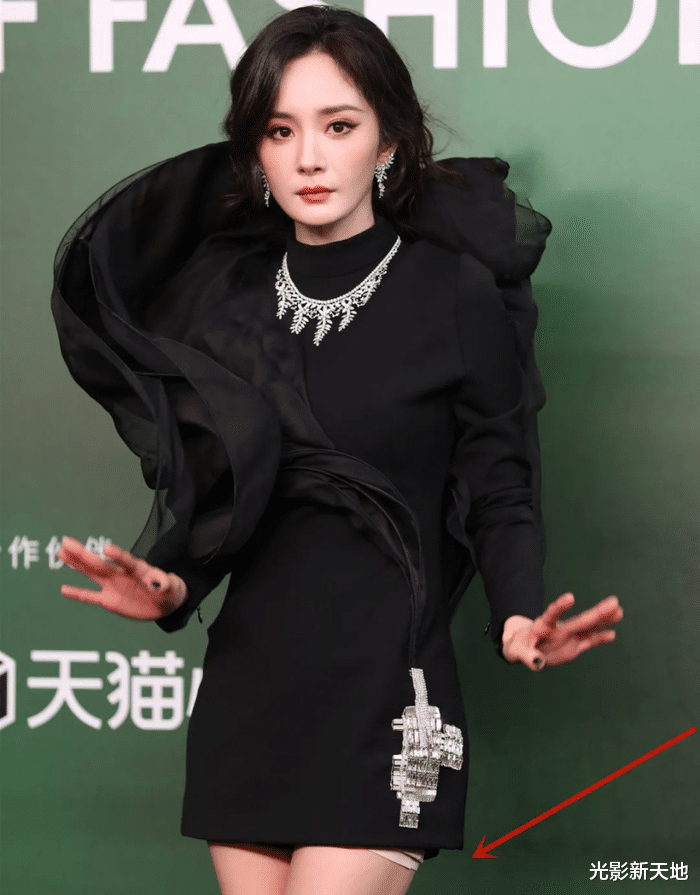 问题出在裙子稍微短了点,一不小心露出了打底裤,就特别煞风景,这是着装的细节,团队工作人员还是不够细心没考虑到。如果打底裤短一点,哪怕换成深色的打底裤都没有这么扎眼。
