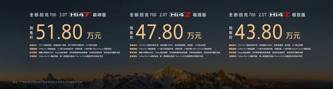 【懂车之道 产品】近日,懂车之道获悉,3月30日,新款坦克700 Hi4-T/Hi4-Z正式开启预售,Hi4-T推出一款车型,预售价为51.8万元;Hi4-Z共推出两款车型,预售价分别为43.8万元和47.8万元。Hi4-T配备非解耦四驱结构,主打强悍越野性能属性,Hi4-Z主打泛越野属性。下面,和大家一起来看看新车的产品力如何?