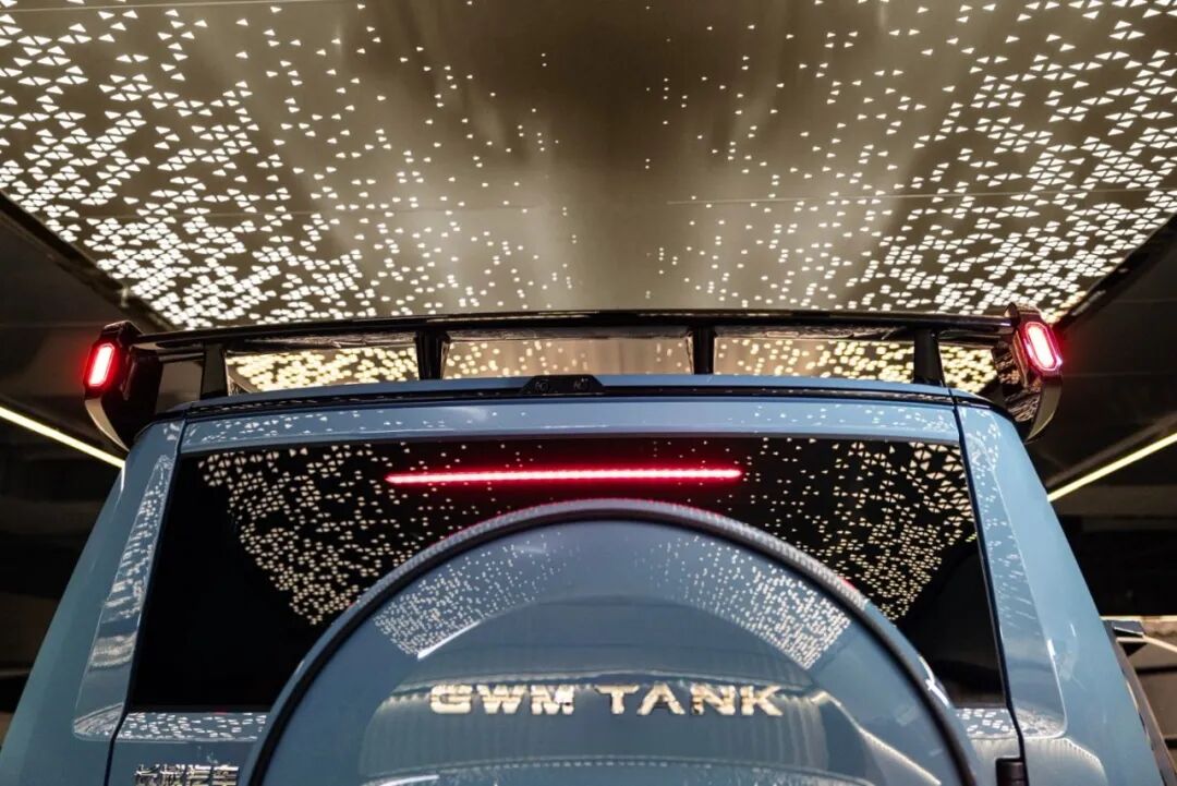 车身尾部,依旧硬派SUV的风格,配备官方命名为“祥麟焰尾”的悬浮扰流板。尾挂备胎罩加入“GWM TANK”字母标识。新车拥有拖挂资质,拖挂总质量为不带制动750kg,带制动2500kg。