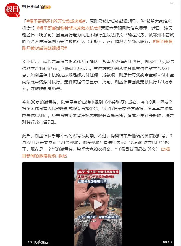 拘留结束后的谢孟伟,转头转战微信视频号继续营业,还在直播里喊出“以前的谢孟伟已经死了,现在是新的谢孟伟,希望大家给次机会”的话,试图卖惨博取同情,挽回路人缘。可如今失信被执行人的身份曝光,狠狠戳穿了他所谓“改过自新”的谎言——连基本的债务都不愿承担,谈何重新做人?