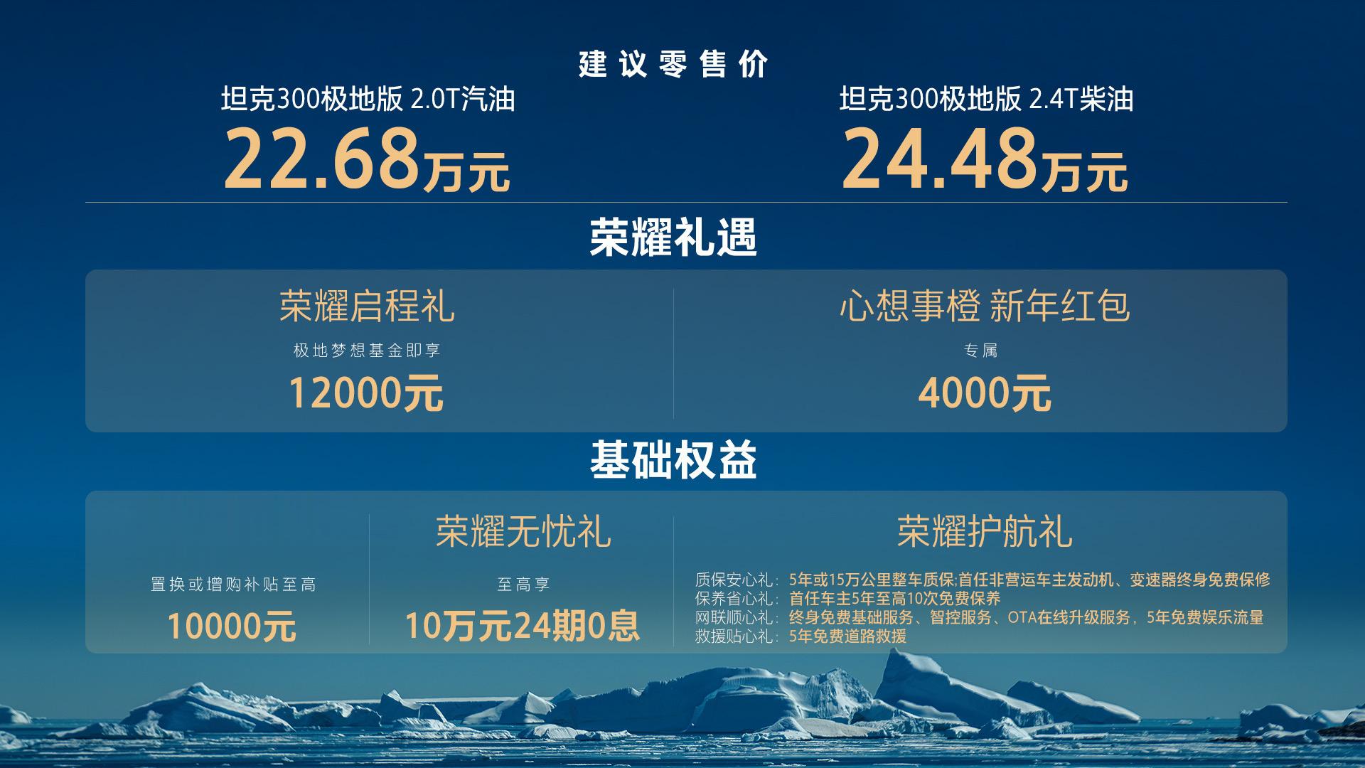 2025年12月11日,恰逢坦克300全球用户突破50万辆的重要里程碑,坦克品牌正式推出全新限量力作——坦克300极地版。新车共提供两种动力版本:2.0T汽油版售价22.68万元,2.4T柴油版售价24.48万元。为回馈用户长期支持,品牌同步推出“荣耀启程礼”、“心想事橙”新年红包,以及涵盖保养、救援、金融等在内的多项专属购车权益,进一步提升极地版用户的尊享体验。