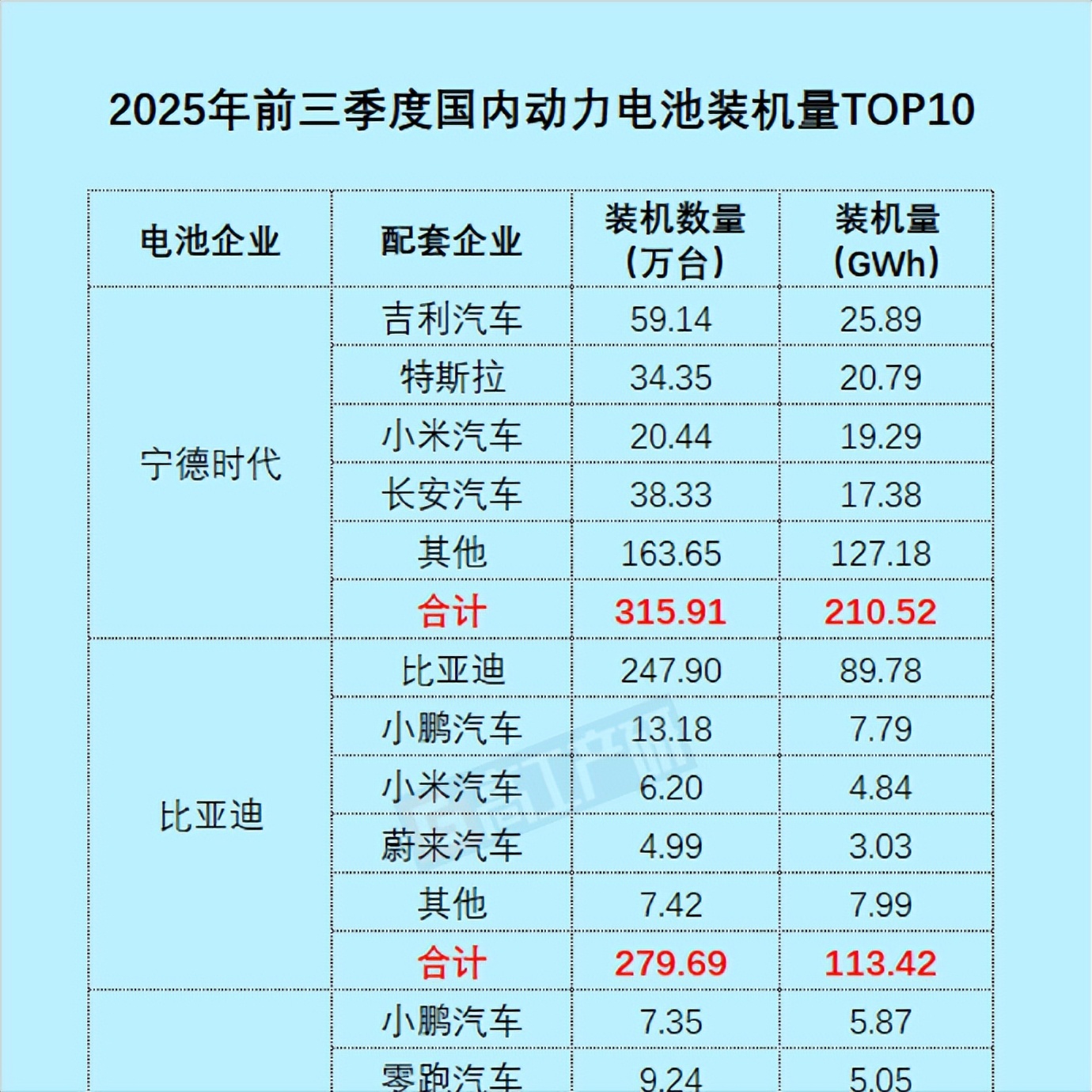 我们列个数据:根据高工锂电数据,2025年前三季度,比亚迪国内动力电池总装机量113.42GWh,其中外供装机量达23.65GWh,主要以小鹏汽车、小米汽车以及蔚来为代表的新势力为主,外供占比提升至20.85%。这意味着,每5GWh装机量中,就有1GWh供应给外部车企,较2024年实现2倍以上增长。