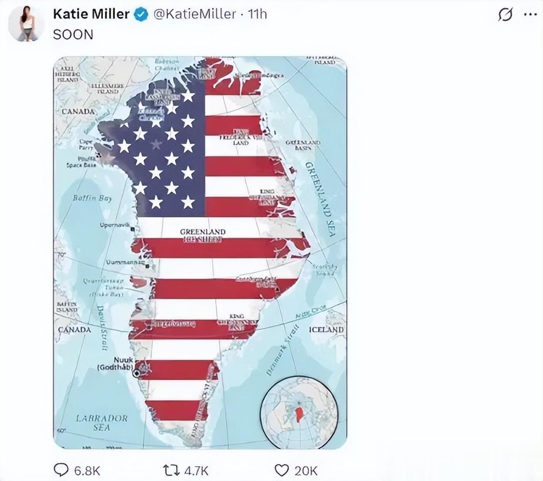 米勒那媳妇儿凯蒂·米勒,在网上直接挂出一张格陵兰岛被美国国旗覆盖的图,配文就俩字儿:很快。这帖子十分钟浏览量破八百万,全世界都看明白了,美国这是要动真格的。