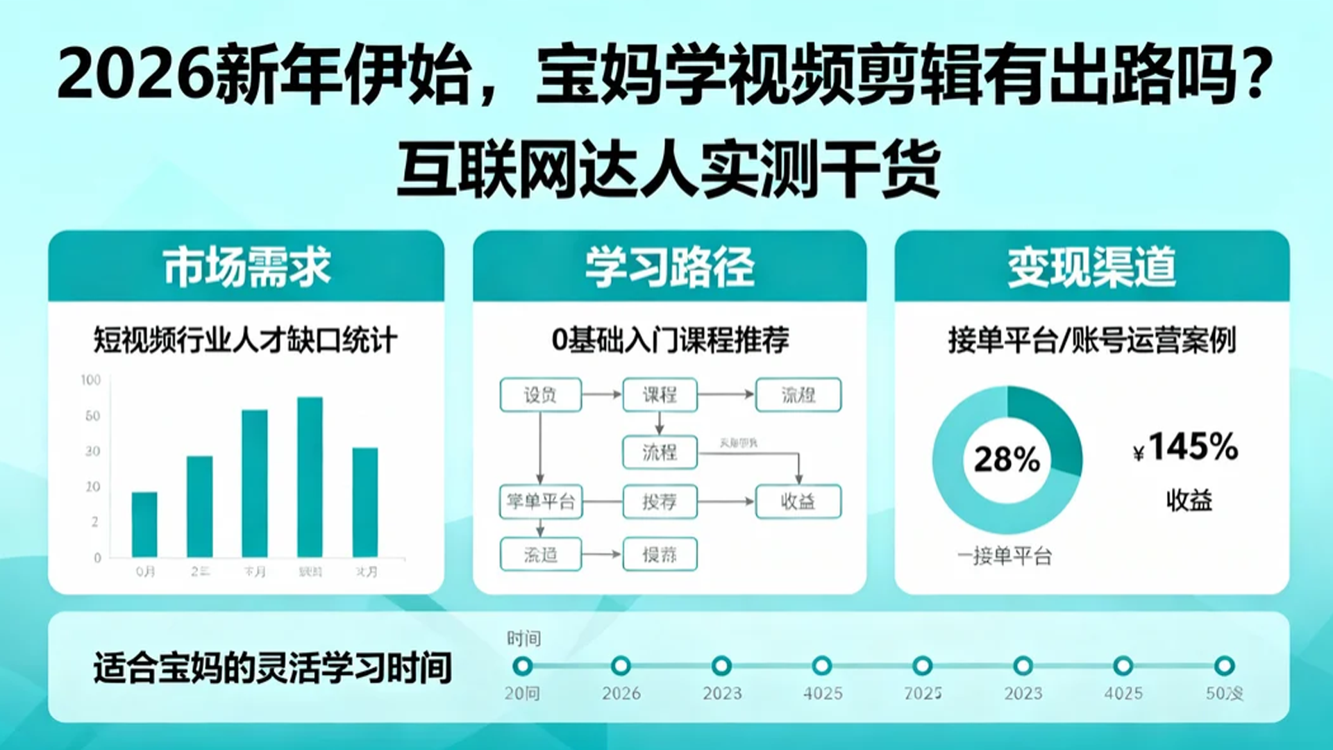 大家好,我是在互联网行业摸爬滚打6年的老玩家,专注拆解各类副业赛道和技能学习逻辑💻。新年刚过,后台收到一堆宝妈姐妹的提问:“2026年学视频剪辑靠谱吗?能不能兼顾带娃和赚钱?” 今天就从行业现状、宝妈适配性、入门路径三个维度,客观聊聊这个问题,全程干货无废话,建议收藏慢慢看~