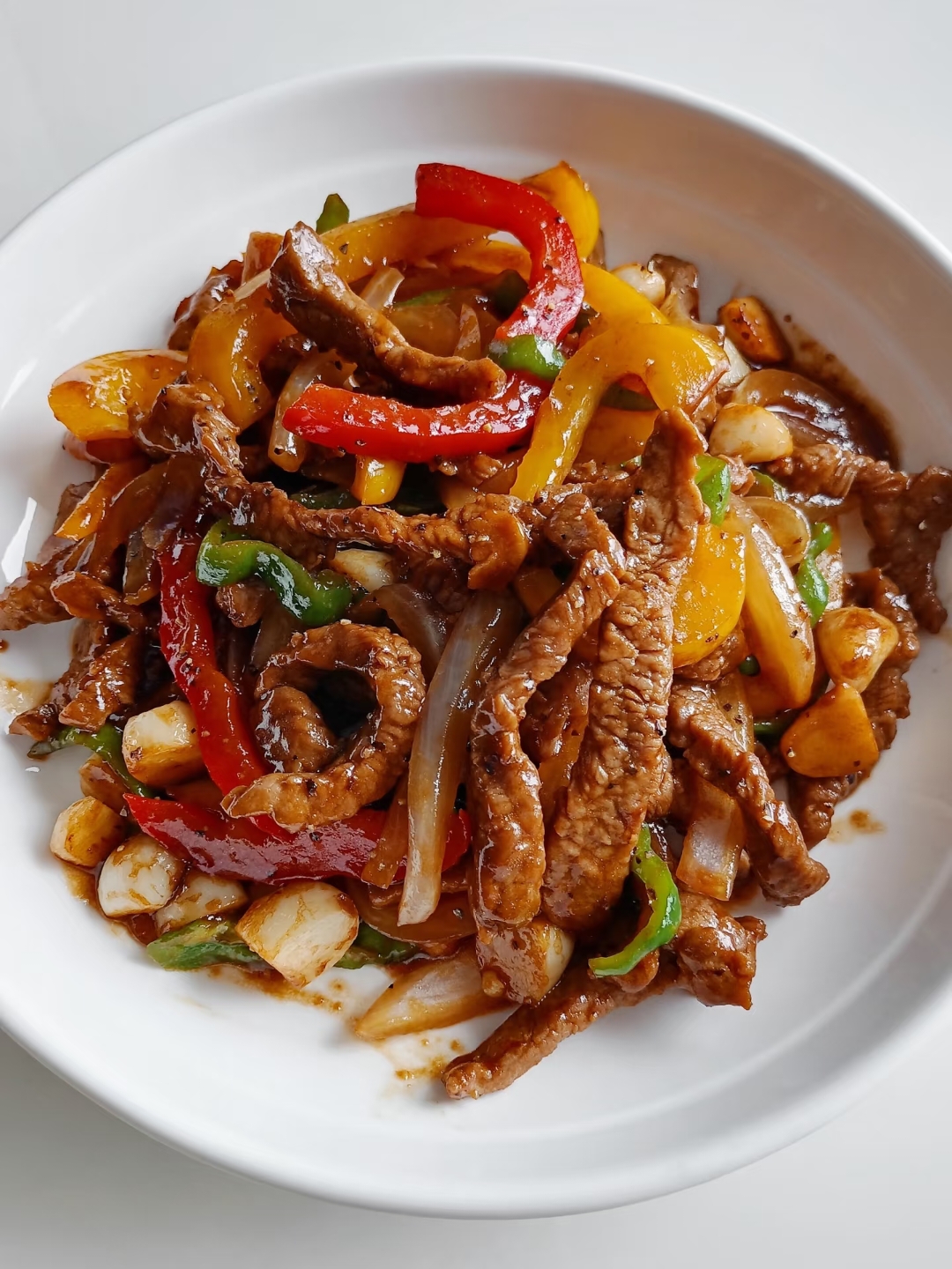 另起锅爆香蒜末,洋葱丝先下锅炒到透明,再放入青红椒。这时候撒入现磨的黑胡椒粒(比黑胡椒粉香十倍!),沿着锅边淋1勺料酒激发香气。最后把牛肉倒回锅中,加1勺生抽、半勺糖提鲜,快速翻炒10秒,关火!整个过程不超过3分钟,堪称“厨房闪电战”。