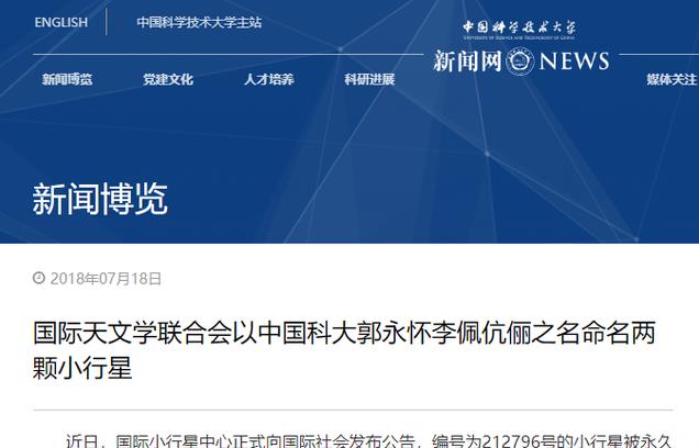 中国科学技术大学中国科大新闻网2018-07-18发布的《国际天文学联合会以中国科大郭永怀李佩伉俪之名命名两颗小行星》