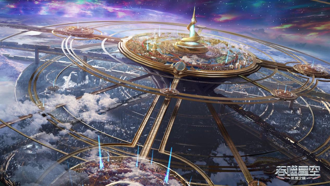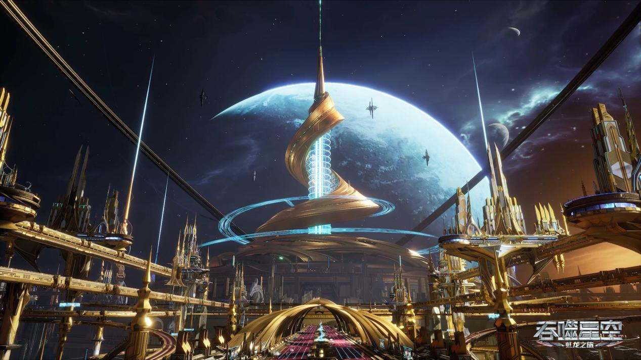 繁华的虬龙星,星球整体都显得富丽堂皇,建筑以金色为主,点缀蓝色和红色,增加科技感和大气,圆形、尖塔形、几何型兼而有之,建筑上反射的金属光泽又非常有质感。