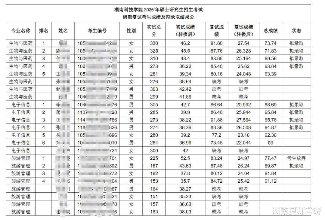 湖南科技学院2026年硕士研究生招生考试调剂复试考生成绩及拟录取结果公示发布!