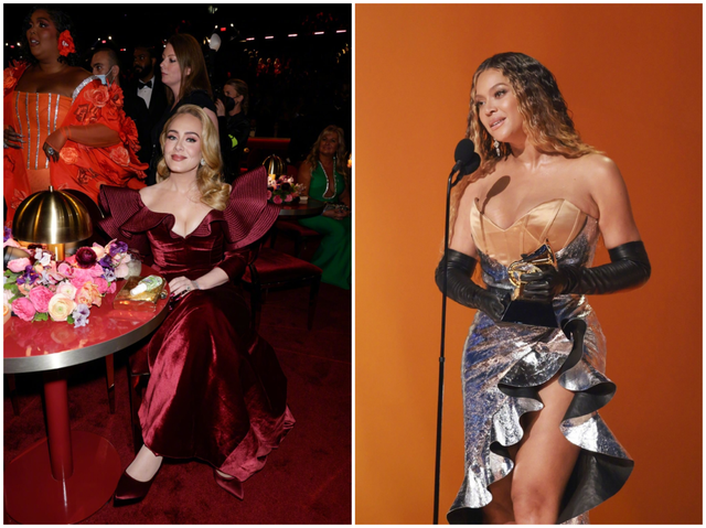 Adele的复古绸缎红裙和Beyoncé的拼接金属荷叶边小礼裙,令一众看客赞叹不已: