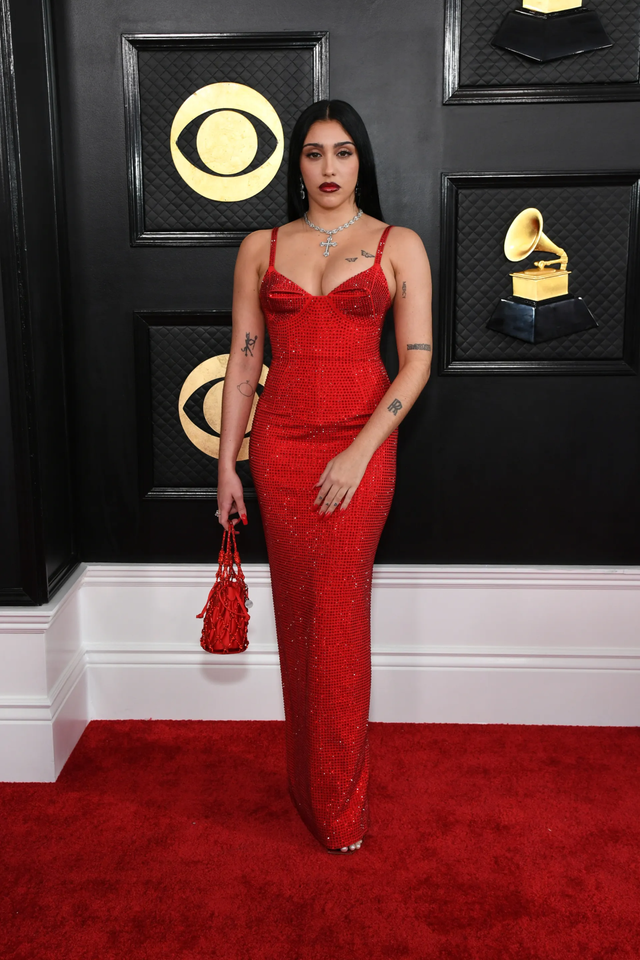 Lourdes Leon的这身红色钻片紧身裙,配上她魅惑冷艳的妆容,在红毯上可谓赏心悦目。
