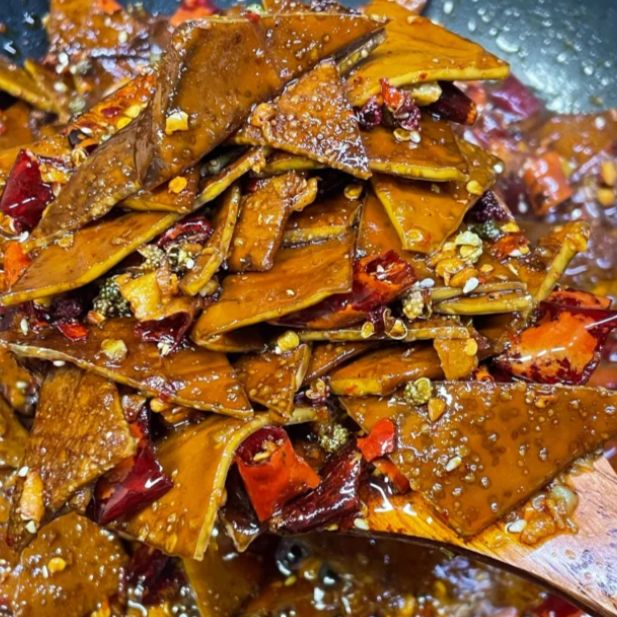 锅中留底油,放入干辣椒、花椒、八角等香料,用小火煸炒出香味。注意火候不宜过大,以免香料炒糊发苦。随后加入姜末、蒜末等调味料继续翻炒,让香料的滋味充分释放。这时将煎好的豆干重新倒入锅中,快速翻炒均匀,使每一块豆干都裹上香料的味道。