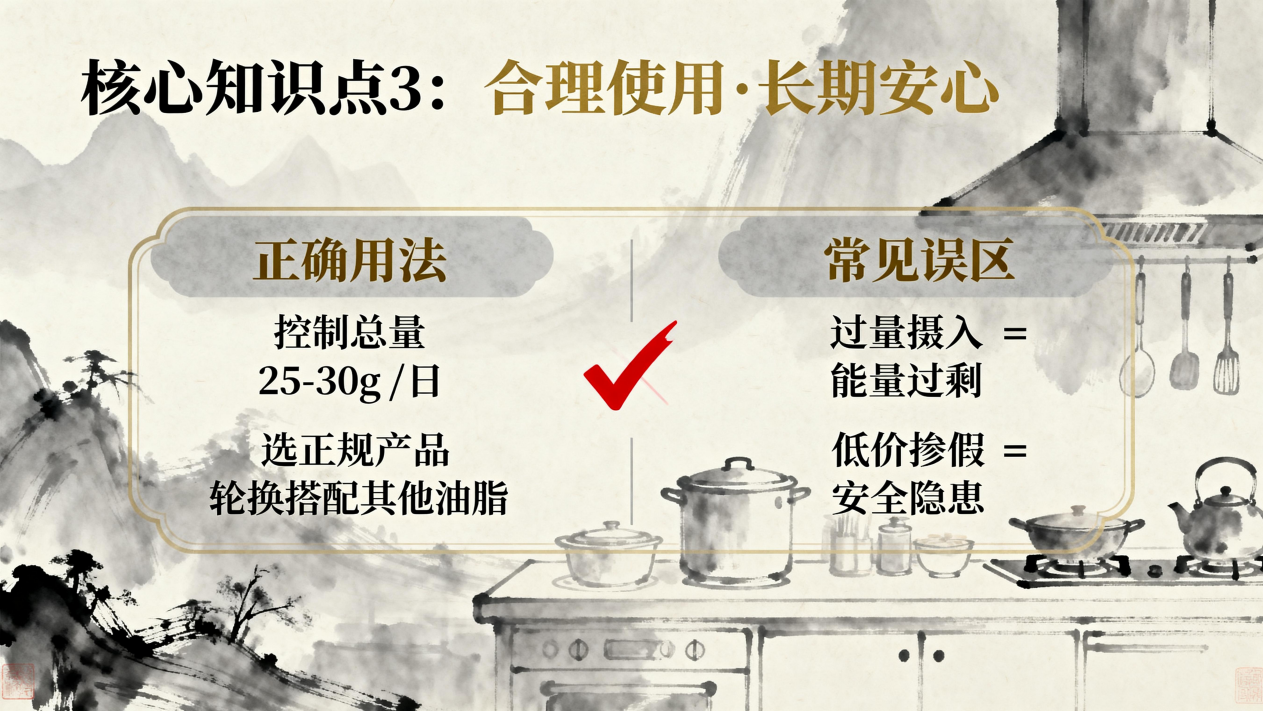 确保品质:选择正规渠道、配料表仅为“山茶籽油”的产品,避免掺假油;