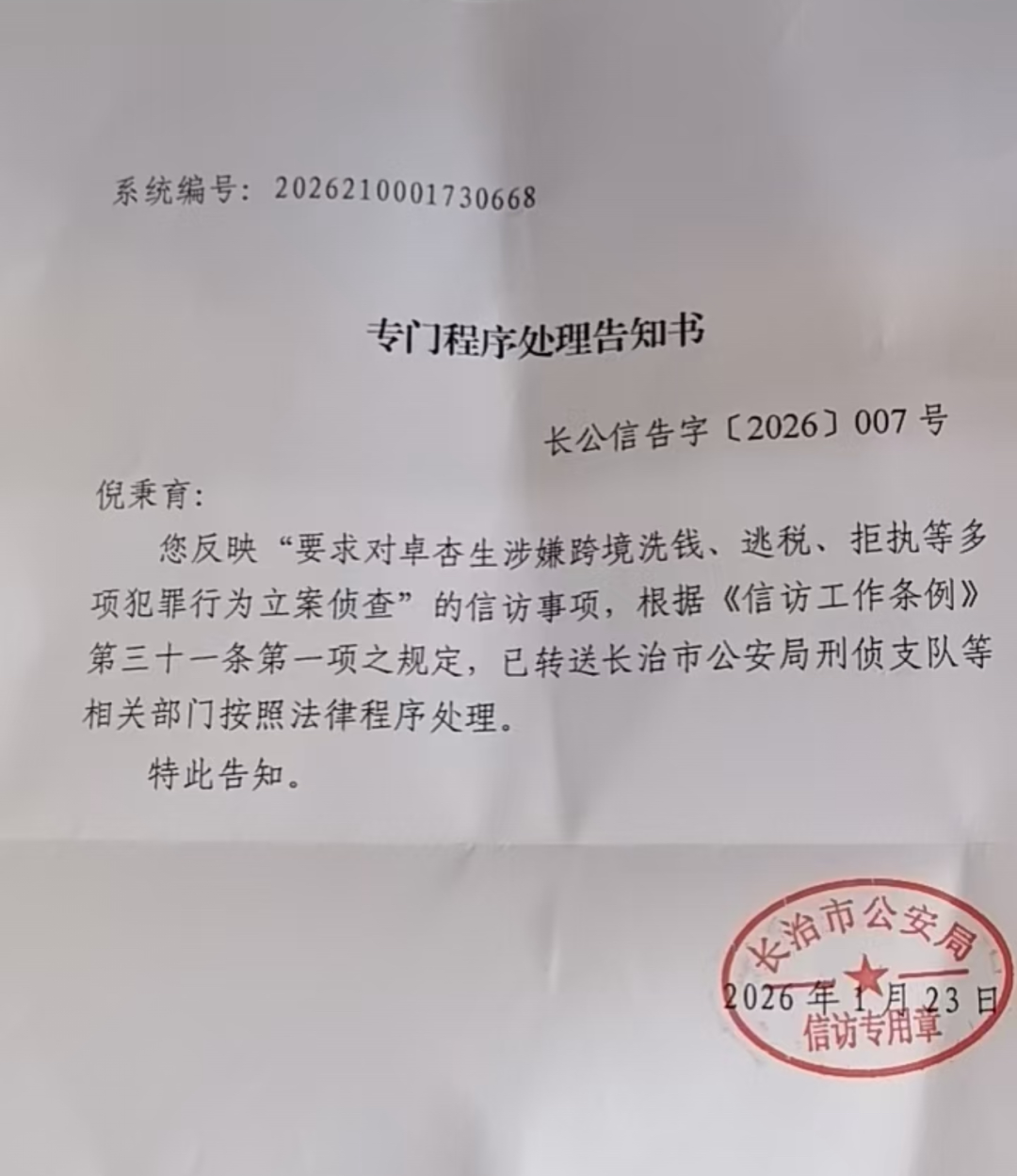 由于卓杏生是惯犯,深受其害的倪秉育等人,于2023年向山西省公安厅对卓杏生进行实名举报。经省公安厅指定,该案交由长治市公安局核查,长治市公安局“扫黑办”专门组建专案组负责本案线索核查工作。