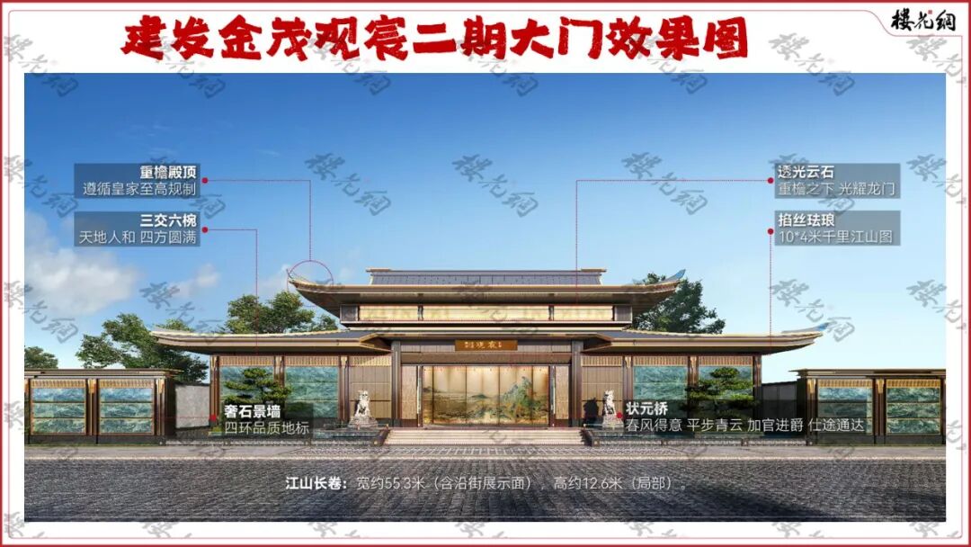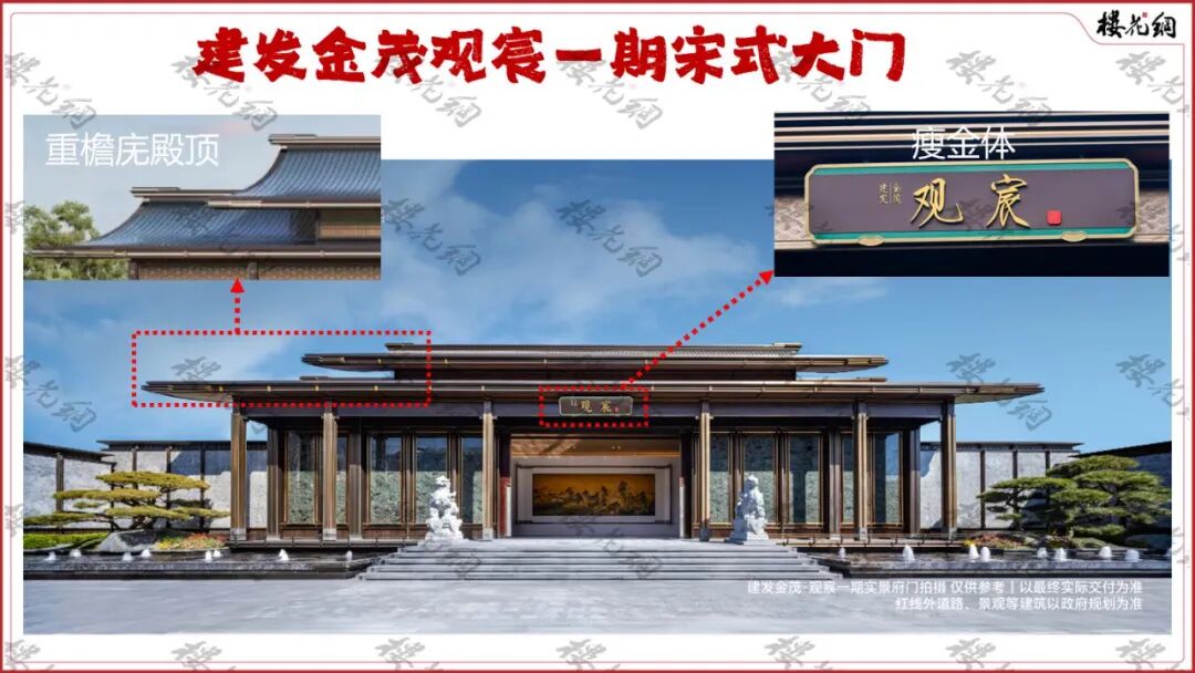 先从招牌大门说起。观宸二期显赫的宋式大门,位于小区西侧,溯源自南宋福建卧龙书院;而一期大门则取意宋徽宗《瑞鹤图》中的宣德门。